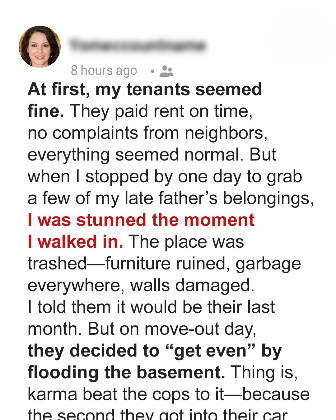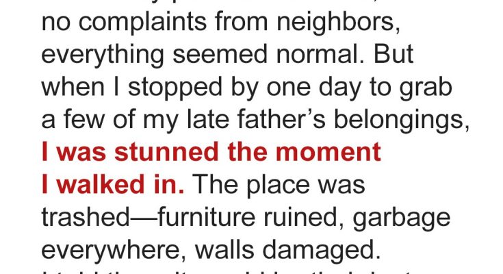 At first, my tenants seemed fine. They paid rent on time, no complaints from neighbors, everything seemed normal. But when I stopped by one day to grab a few of my late father’s belongings, I was stunned the moment I walked in. The place was trashed—furniture ruined, garbage everywhere, walls damaged. It was a warzone. My breath caught in my throat. This was his house. The one he built with his own hands, the one he died in just a year ago. It wasn’t just a rental property; it was the last tangible piece of him I had left. Now it felt like a stranger’s spiteful defilement. My father’s antique mahogany desk, scratched beyond repair. His favorite armchair, slashed open.