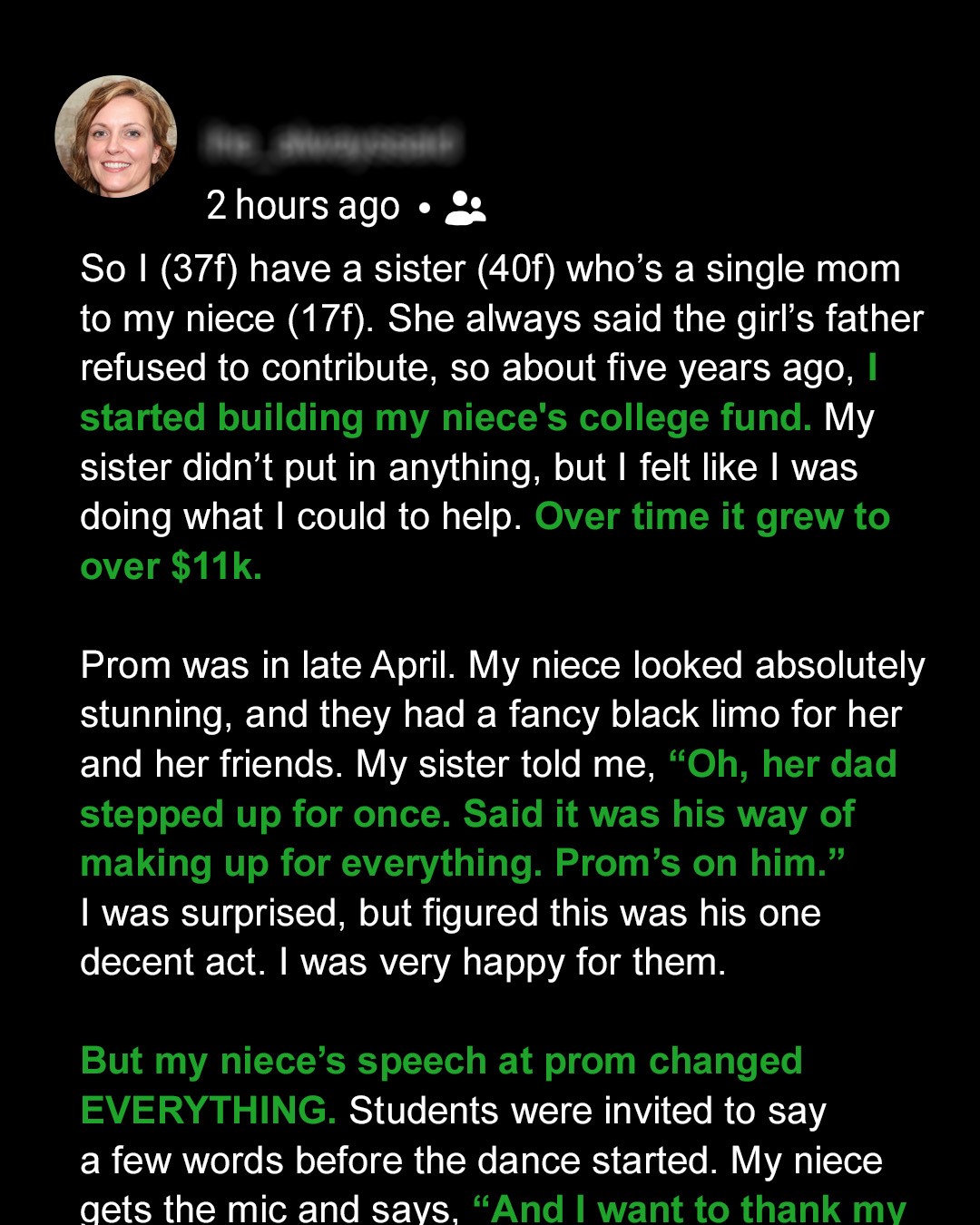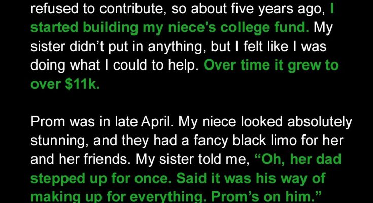 I pulled up the statement for the college fund I had been building for my niece. The account I had carefully nurtured, penny by penny, for five years. And there, exactly two days before prom, was a massive withdrawal. The exact same four-figure sum as the limo receipt. Not just for the limo, I realized. For the dress, for the fancy dinner, for everything. My sister hadn’t just used my credit card. She had drained that money directly from the college fund. From her own daughter’s future. And then, she had looked me in the eye, that night, and lied. She blamed the ‘dad’ who supposedly stepped up. The dad she’d always painted as a villain. The dad she made me believe was reason enough for me to sacrifice my own savings.