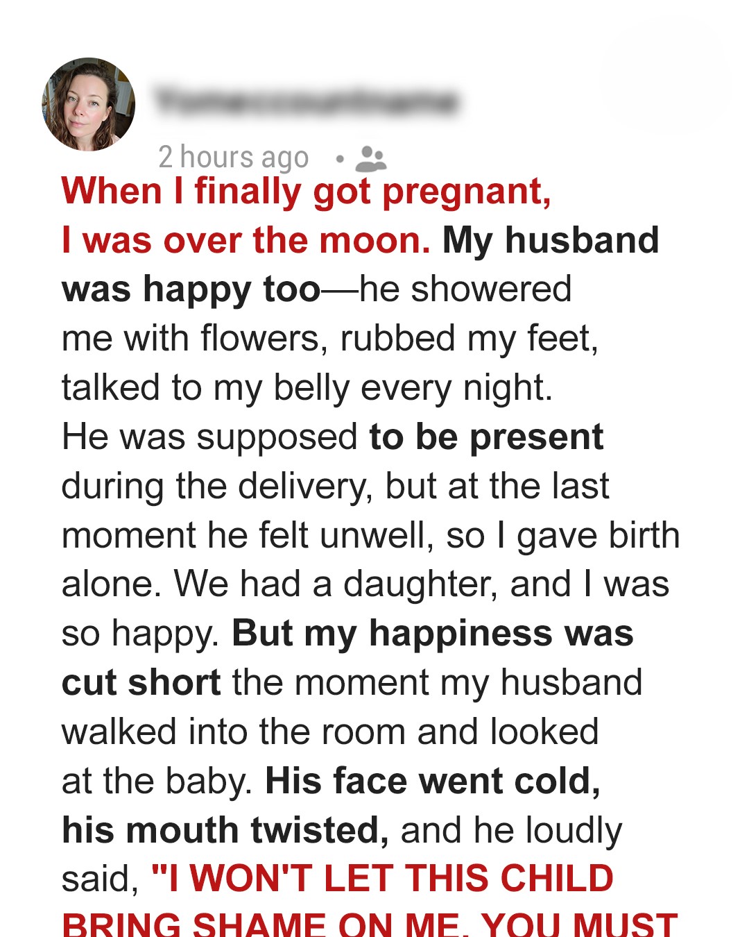 When I finally got pregnant, I was over the moon. After years of trying, of endless cycles of hope and crushing disappointment, seeing those two lines felt like a miracle. My husband was happy too—happier than I’d ever seen him. He showered me with flowers, brought me my favorite snacks, rubbed my aching feet every night without me even asking. He talked to my belly, his voice soft and tender, whispering promises to our little one. We picked out names, we decorated a nursery, we planned for every single detail. He was supposed to be present during the delivery, holding my hand, sharing that sacred moment. We’d talked about it endlessly. But at the last moment, he felt unwell. A sudden, violent stomach bug, he said. He looked pale, insisted I go without him, told me he was heartbroken to miss it. I understood. I really did. I focused on the contractions, on the overwhelming task ahead. I gave birth alone, exhausted but exhilarated, to the most beautiful little girl I had ever seen. Ten fingers, ten toes, a tiny cry that filled the room and my heart. I was so happy. Truly, incandescently happy. I pulled out my phone, eager to send him a picture, to share our daughter with him.