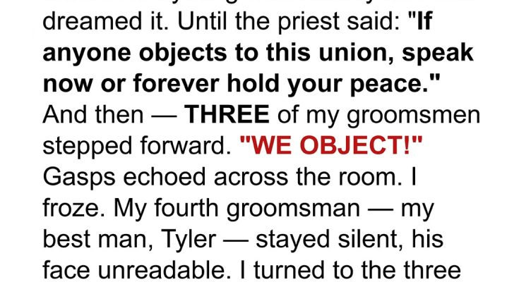 Ellie looked stunning in her wedding dress. Everything was exactly as I had dreamed it. Until the priest said: “If anyone objects to this union, speak now or forever hold your peace.” And then — THREE of my groomsmen stepped forward. “WE OBJECT!” Gasps echoed across the room. I froze. My fourth groomsman — my best man, Tyler — stayed silent, his face unreadable. I turned to the three and snapped: “WHAT THE HELL ARE YOU DOING?” “Buddy, you need to see it. LOOK AT HER HAND. HER RING FINGER.” Confused, I grabbed Ellie’s left hand gently. She immediately pulled it back but I still saw.