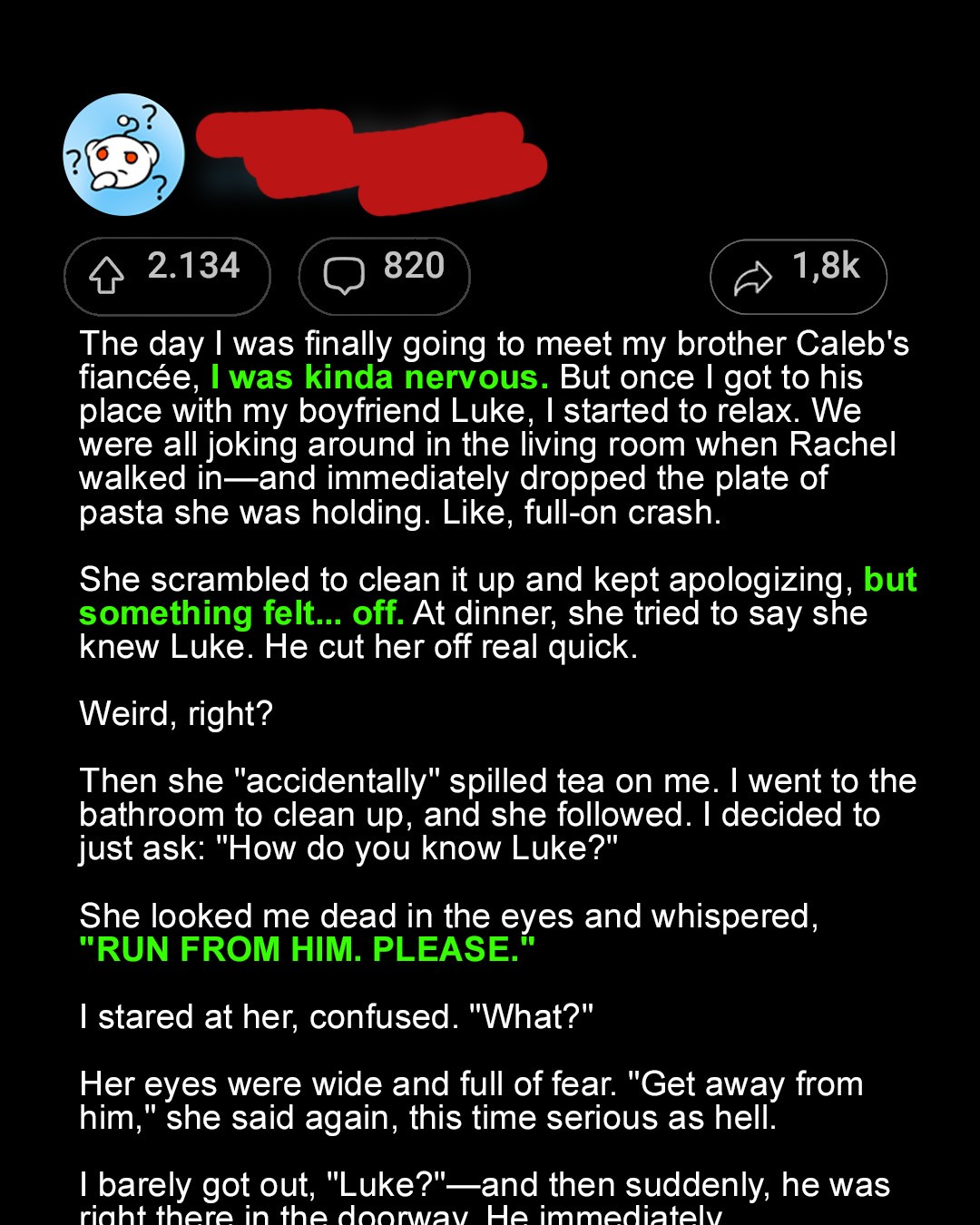 The day I was finally going to meet my brother’s fiancée, I was kinda nervous. I wanted to like her, of course, but you know how it is. What if she’s weird? What if we have nothing in common? My boyfriend, Luke, squeezed my hand in the car. He was always so good at making me feel at ease. “She’s going to love you,” he murmured, and I leaned into his warmth. He had this way of making everything feel safe. We arrived at my brother’s place, full of laughter and a bottle of wine. We were all joking around in the living room, settling in, when the kitchen door swung open. And there she was. My brother’s fiancée. Rachel. She was holding a plate piled high with pasta, a smile on her face that faltered the second her eyes landed on Luke. The plate tilted, then slipped. It crashed to the floor, pasta scattering everywhere like a grotesque confetti. She gasped, a small, choked sound, her face draining of color. She scrambled to clean it up, apologizing profusely, “Oh my god, I am so, so sorry, I don’t know what happened.”