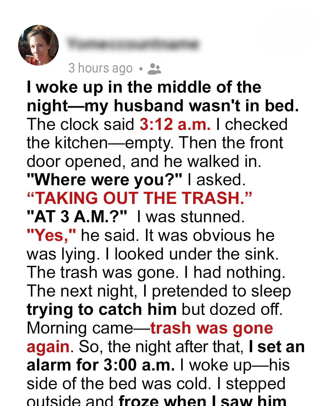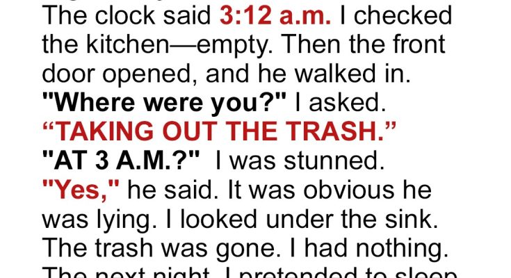 I woke up in the middle of the night—my husband wasn’t in bed. The clock said 3:12 a.m. Just a bad dream? I stretched, reaching for his warmth, but found only cold sheets. I swung my legs over the side, a prickle of unease creeping up my spine. I checked the kitchen—empty. The living room, the study, nothing. Then the front door opened, a quiet click, and he walked in. He looked tired, a little disheveled. My heart was pounding.