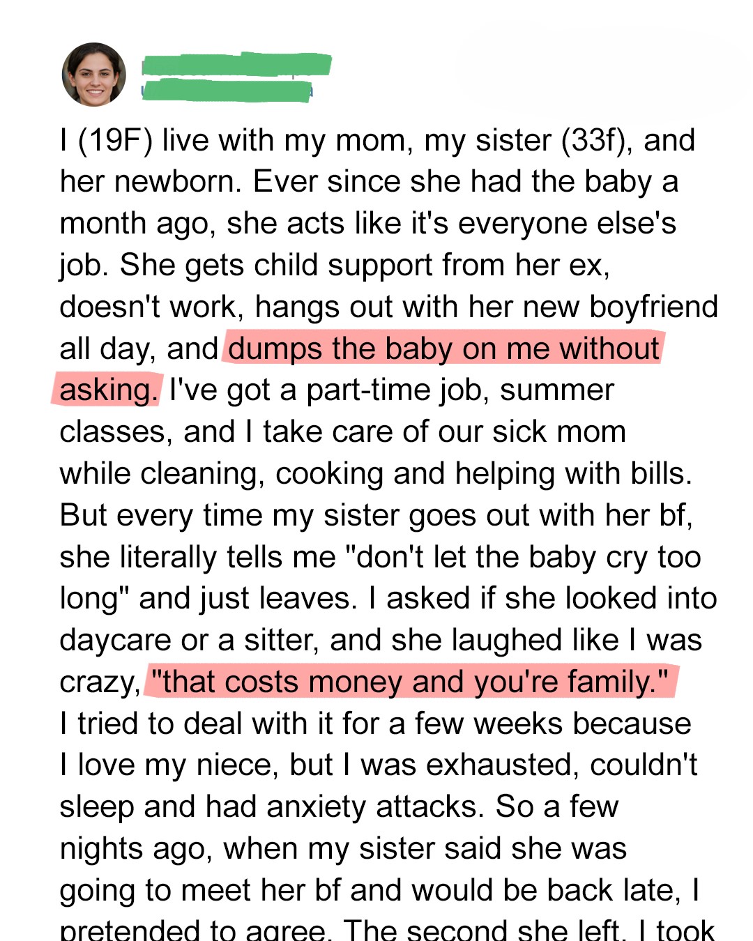 I tried talking to her. “Have you looked into daycare? Or even a sitter?” I asked, my voice barely a whisper. She just laughed. A loud, dismissive bark. “Daycare? That costs money! And you’re family.” It’s her favorite phrase, a shield to justify her complete abandonment. I’m family, so I’m her maid, her nurse, her bank, her unpaid nanny. I pay for groceries, utilities. I’ve even bought formula when her “child support” money mysteriously ran out. NO, I don’t have time for this! My part-time job barely covers my own expenses, let alone half a household. My grades are slipping.