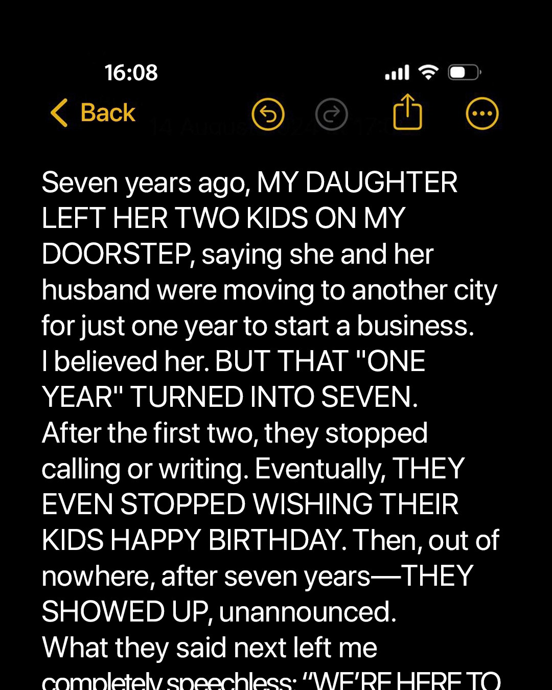 Seven years ago, my daughter left her two kids on my doorstep. Just for a year, Mom, she’d said, clutching her husband’s arm. To start a business in the city. A fresh start. It’s for their future. My heart ached watching my grandchildren, then five and three, look up at me with wide, trusting eyes. I believed her. I truly did. That “one year” turned into two, then three. The calls became sporadic, then stopped entirely. Postcards dwindled to nothing. We sent them school photos, drawings, stories of first steps and new words. No reply. Then, the birthdays. First, a belated text. Then, a ghost of a message. Eventually, THEY EVEN STOPPED WISHING THEIR OWN CHILDREN HAPPY BIRTHDAY. My grandchildren. My sweet, innocent babies, left to wonder why Mommy and Daddy didn’t care.