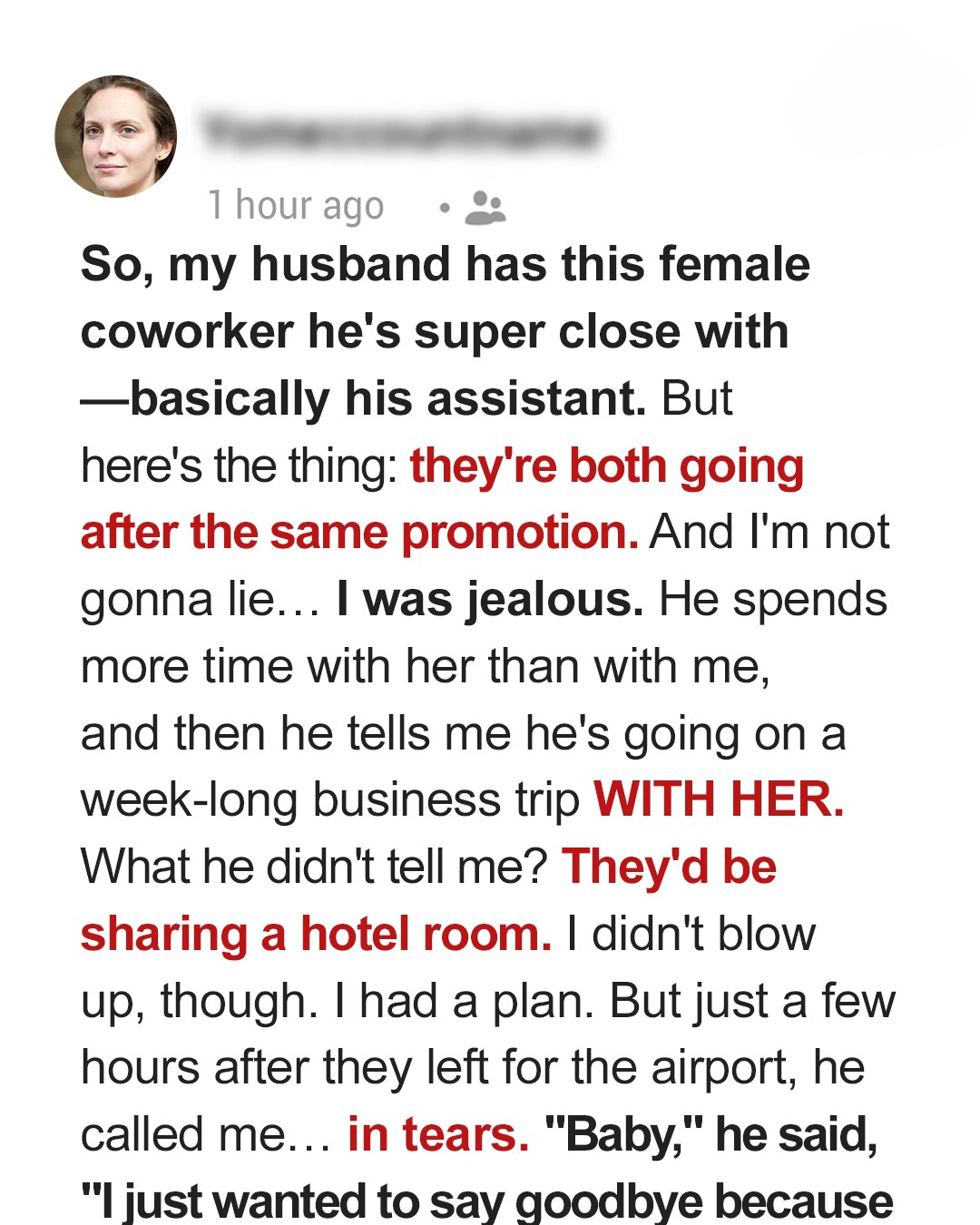 It all started so innocently, didn’t it? My husband has this coworker, his assistant, really. Always hovering, always there. He swore it was professional, just business. But I saw the glances, the way they laughed at each other’s jokes, the way he seemed to light up more around her. I swallowed the jealousy, told myself I was being silly. He loves me. Then came the promotion. The same promotion. Now it wasn’t just “assistant,” it was direct competition. And suddenly, he was spending more time with her prepping, strategizing, than he was with me. My stomach twisted. It felt like a slow, agonizing betrayal, even if it was just in my head. Was it just in my head?