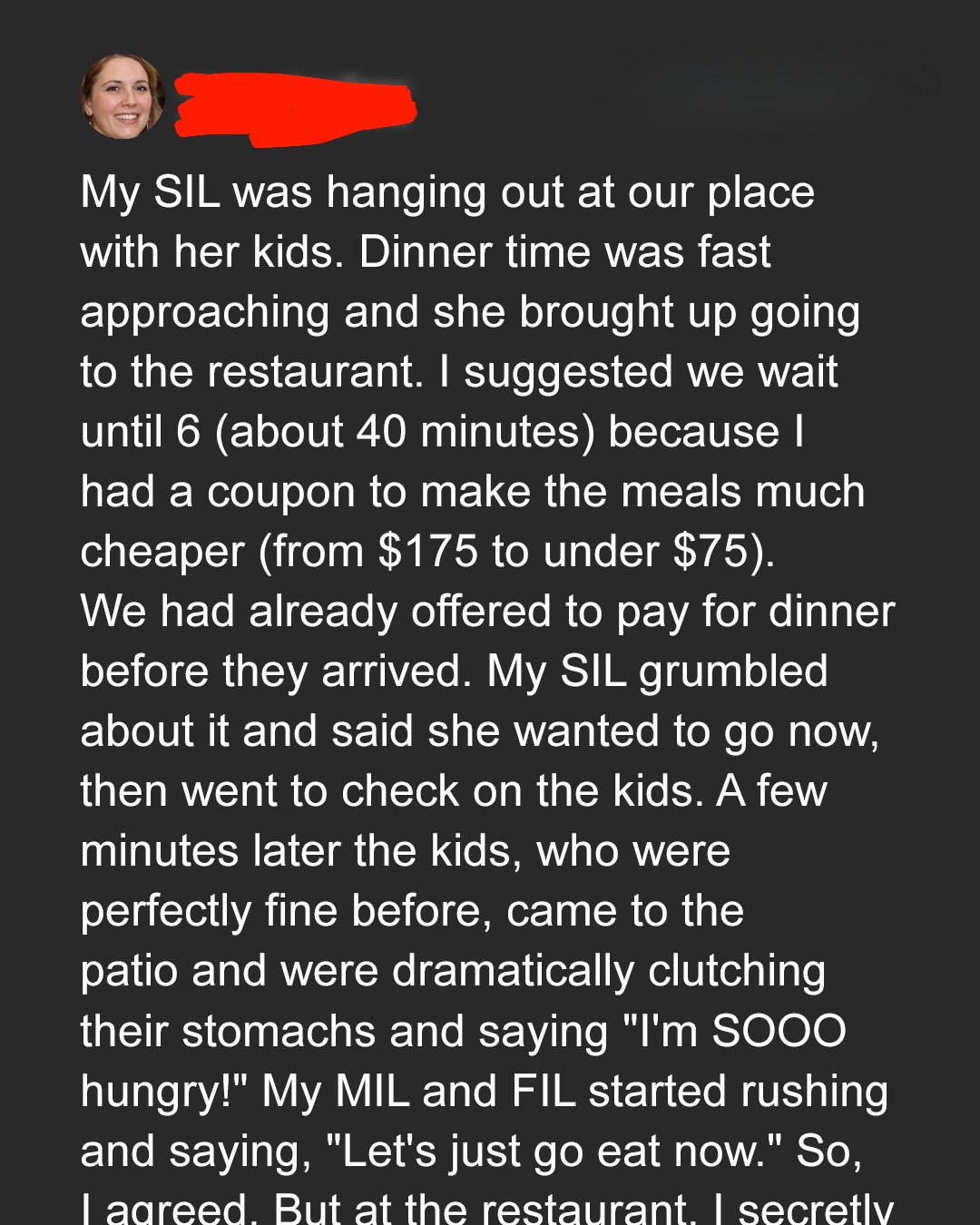 I still replay that day in my head, every single detail, every agonizing second. It started so innocently. My SIL was over with her kids, filling our house with their usual boisterous energy. We’d spent a decent afternoon, and as dinner approached, I felt that familiar warmth of being the host. I genuinely love having family around. Dinner time neared, and she brought up going out. A nice gesture, I thought. I’d already told her we’d take care of the bill, as a treat. Then I remembered. “Hey,” I said, “how about we wait just another 40 minutes? I have this fantastic coupon, makes the whole meal so much cheaper. We’re talking like, from $175 down to under $75.” A hundred dollars saved, just for a little patience. It seemed like such a no-brainer.
