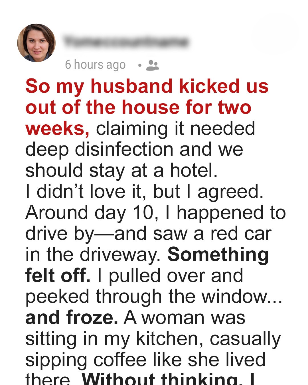 The request came out of nowhere. “Babe,” he’d said, his voice a little too casual, “we need to clear out. Deep disinfection. Two weeks. Hotel.” My heart sank. Two weeks? Away from our home? It felt excessive, a strange demand. But he insisted, talking about allergens and air quality, making it sound like he was doing it for us, for our health. He’d booked a nice hotel, planned activities. I grumbled, but ultimately, I trusted him. We’d been together for years, built a life, a beautiful family. He’d never given me a reason to doubt. Around day ten, a creeping unease started to settle. The hotel felt sterile, impersonal. I missed our bed, the scent of our coffee brewing in our kitchen. I needed to pick up a forgotten document anyway, a flimsy excuse, but a powerful draw. I told him I was going to grab a few things. He’d seemed… distracted. A little too eager for me to go alone. As I turned onto our street, my stomach clenched. A bright red car, not ours, was parked in our driveway. My breath hitched. Who was that?