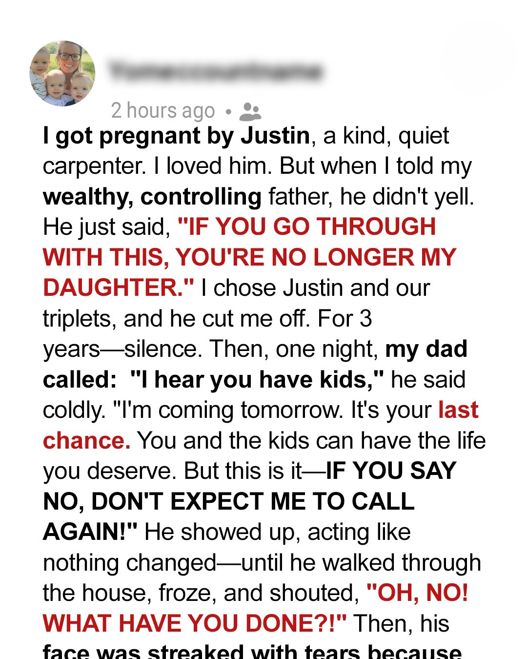It started with a carpenter. Kind. Quiet. Justin. I’d never known a love so gentle, so steady, so utterly unlike the world my wealthy, controlling father had built around me. He was everything my father wasn’t: humble, earnest, without pretense. When I found out I was pregnant, my heart swelled. We were going to build a life, a real one, together. A simple life, but one overflowing with love. Then I told my father. He didn’t yell. I expected screaming, a rage of epic proportions. Instead, his voice was a calm, chilling monotone. “IF YOU GO THROUGH WITH THIS, YOU’RE NO LONGER MY DAUGHTER.” Just like that. A choice. Him or my love, my future. The words echoed in my ears, cold and final. I chose Justin. I chose our babies. Our triplets. Three tiny heartbeats, beating only for us. My father kept his word. For three years, silence. A deafening, absolute void where a parent used to be. We struggled. Justin worked tirelessly, his hands rough and strong. Our small house was a constant whirlwind of diapers and laughter, a testament to what love could build, even from nothing. My heart ached for my father, sometimes, in the quiet of the night, but never for my choice.