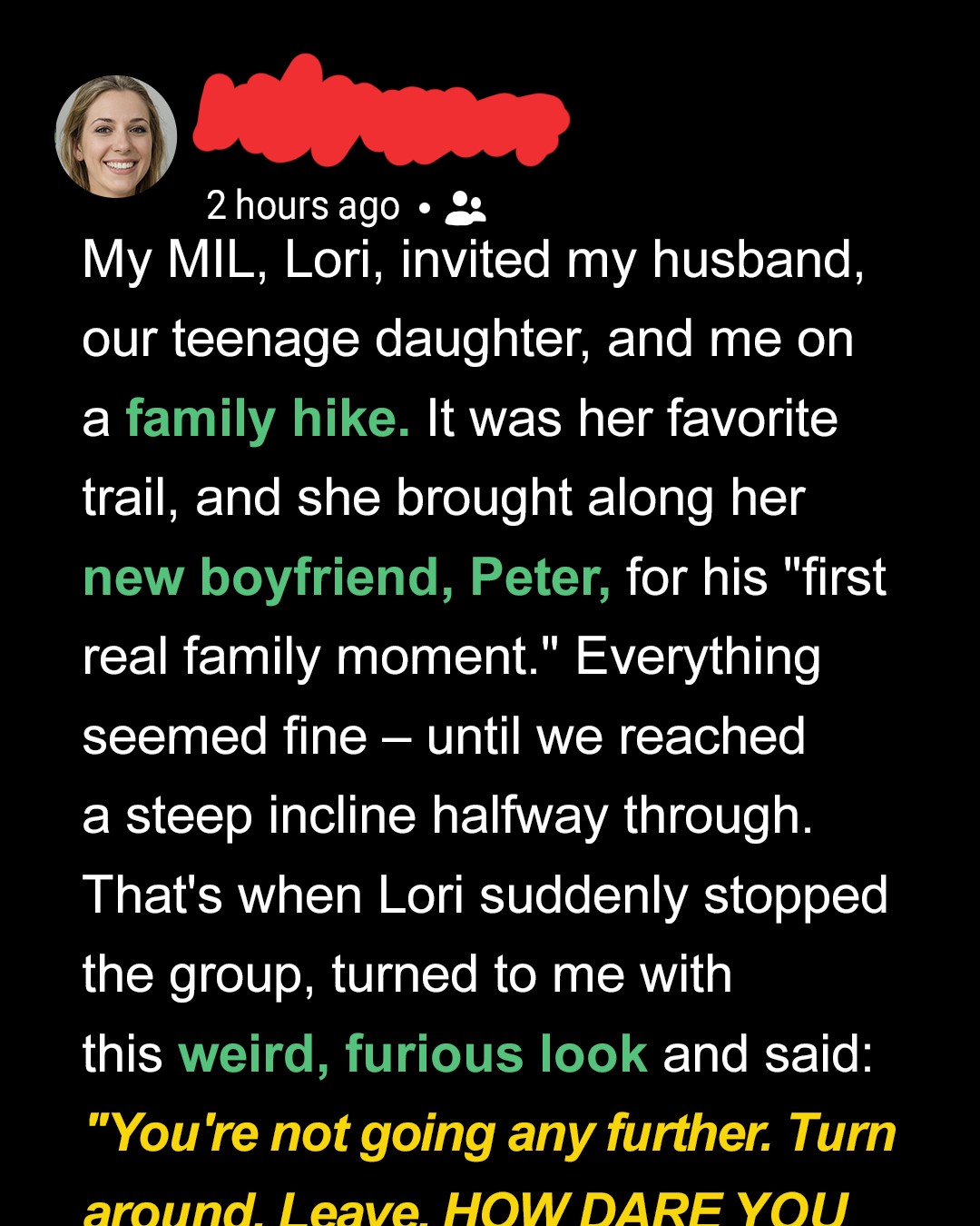 The sun was already high, beating down on us as we started the hike. My MIL was practically radiating. This was her trail, her favorite, and she’d been so excited to finally bring her new boyfriend, Peter, along. A real family moment, she’d gushed, his first with all of us. My husband walked beside me, his arm brushing mine. Our teenage daughter, earbuds in, trailed a bit behind us, doing her best to look bored. Everything felt… normal. Almost too normal. We laughed at my MIL’s corny jokes. The new boyfriend, a quiet man with kind eyes, smiled politely. He seemed nice enough, if a bit stiff. My MIL kept reaching for his hand, a little too often, a little too possessively. She deserves to be happy, I told myself, pushing down a familiar flicker of unease.