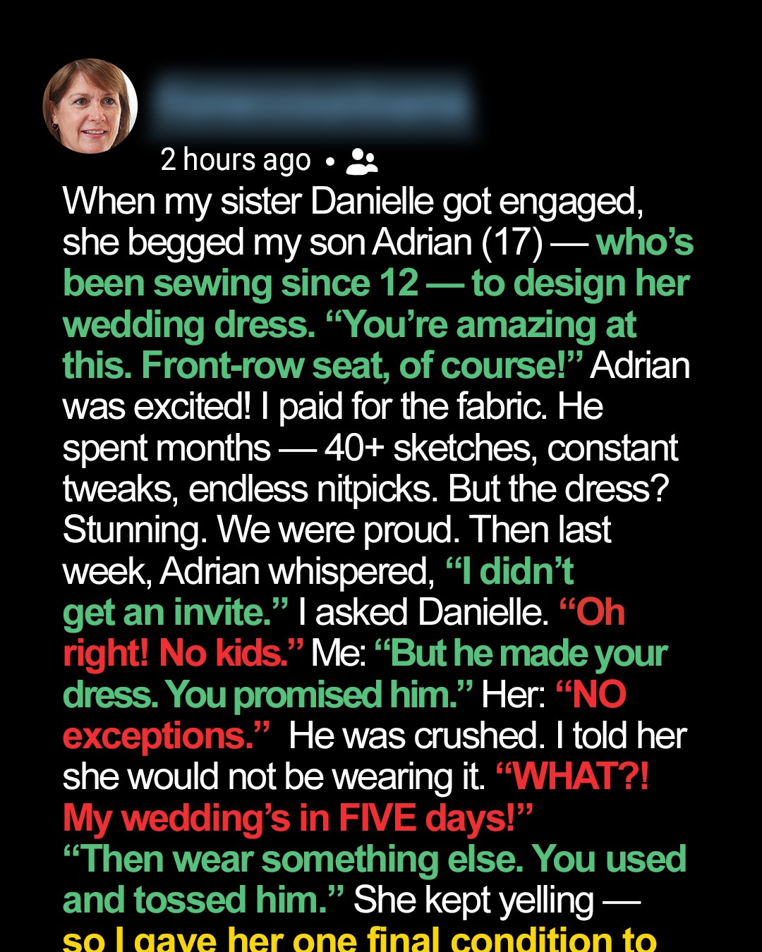 The raw sting of Adrian’s whispered confession still burned: “I didn’t get an invite.” My heart actually ached. He’s 17, but still my baby. Danielle, my own sister, had begged him to design her wedding dress. “You’re amazing at this. Front-row seat, of course!” she’d cooed. Adrian, who’s been sewing since he was 12, had been beyond thrilled. He poured his soul into it. Months. Forty-plus sketches. Endless nitpicks from her, but he just worked harder, determined to make her dream come true. I paid for all the expensive fabric, watched him meticulously craft every seam. The dress was stunning. We were so proud. Then I called Danielle. “What about Adrian’s invite?”