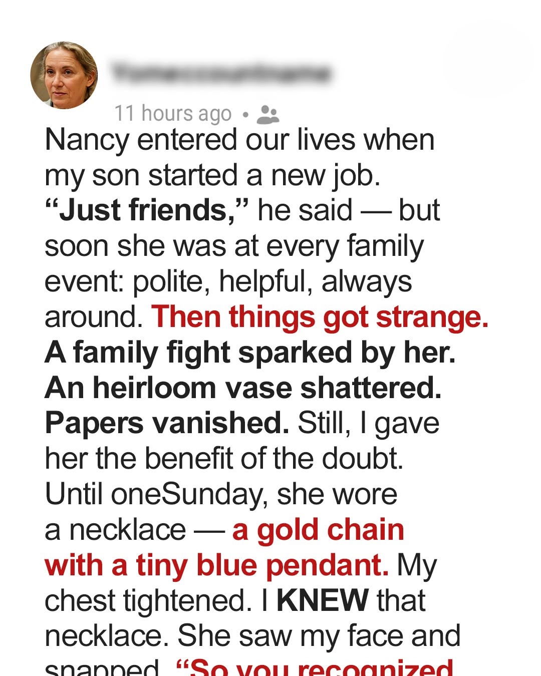 Until one Sunday, she wore a necklace — a gold chain with a tiny blue pendant. My chest tightened. I KNEW that necklace. I felt the blood drain from my face. She saw my face and her smile… it didn’t falter. It just widened, ever so slightly, with a look that sent a chill down my spine. Pure ice.