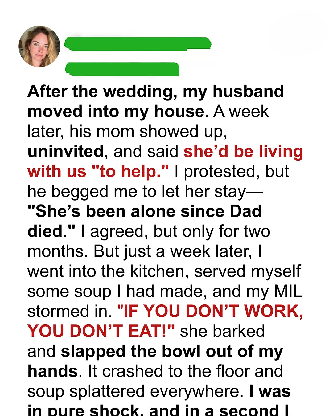 “IF YOU DON’T WORK, YOU DON’T EAT!” she barked and slapped the bowl out of my hands. It crashed to the floor and soup splattered everywhere. I was in pure shock. My kitchen. My soup. My home. The ceramic shards glinted under the harsh overhead light, a perfect reflection of the sudden, brutal shattering of my new marriage. My husband rushed in, not to comfort me, not to scold her, but to scoop up the broken pieces. “Mom, please,” he murmured, his voice barely a whisper. He didn’t even look at me.