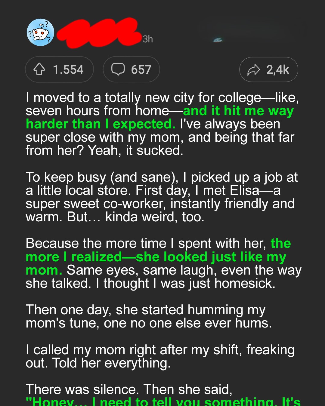 It hit me way harder than I expected, moving to a totally new city for college—like, seven hours from home. I’ve always been super close with my mom, and being that far from her? Yeah, it sucked. A constant, low thrum of missing her in my chest. To keep busy (and sane), I picked up a job at a little local store. First day, I met Elisa—a super sweet co-worker, instantly friendly and warm. But… kinda weird, too. Because the more time I spent with her, the more I realized—she looked just like my mom. Same eyes, same laugh, even the way she talked. I thought I was just homesick.
