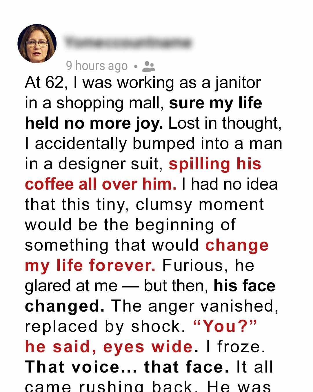 At 62, I was working as a janitor in a shopping mall, sure my life held no more joy. Lost in thought, I accidentally bumped into a man in a designer suit, spilling his coffee all over him. I had no idea that this tiny, clumsy moment would be the beginning of something that would change my life forever. Furious, he glared at me — but then, his face changed. The anger vanished, replaced by shock. “You?” he said, eyes wide. I froze. That voice… that face. It all came rushing back. He was my husband. My blood ran cold. My heart slammed against my ribs. Thirty years. Three decades since I last saw him. He was younger then, leaner, full of dreams, not this polished, powerful stranger. Yet, the eyes were unmistakable. The way his brow furrowed when he was truly surprised. He looked successful, wealthy. And I, I was just a ghost, scrubbing floors, existing. My hands trembled, the mop bucket suddenly heavy as lead.