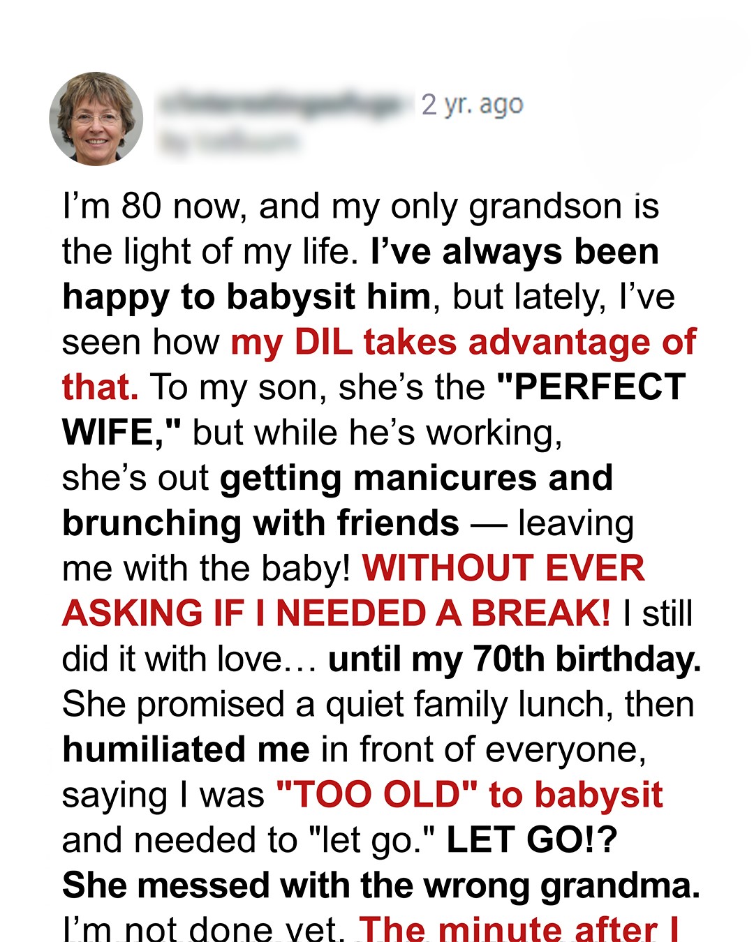 I’m 80 now, and my only grandson is the light of my life. He’s everything good in this world, a tiny, laughing echo of my own son when he was little. From the moment he arrived, I’ve been happy to babysit him. More than happy, really. It felt like a gift, a second chance at those precious early years. I loved every second, the sticky hands, the endless stories, the quiet snuggles. But lately, I’ve seen how my DIL takes advantage of that. Oh, she’s so charming to him, always smiling, always affectionate. To my son, she’s the “PERFECT WIFE,” the loving mother, the woman who completes our family. And he’s so blind, so blissfully unaware. While he’s working, busting his back to provide for them, she’s out getting manicures, having leisurely brunches with her friends, hitting up boutiques – leaving me with the baby! WITHOUT EVER ASKING IF I NEEDED A BREAK!