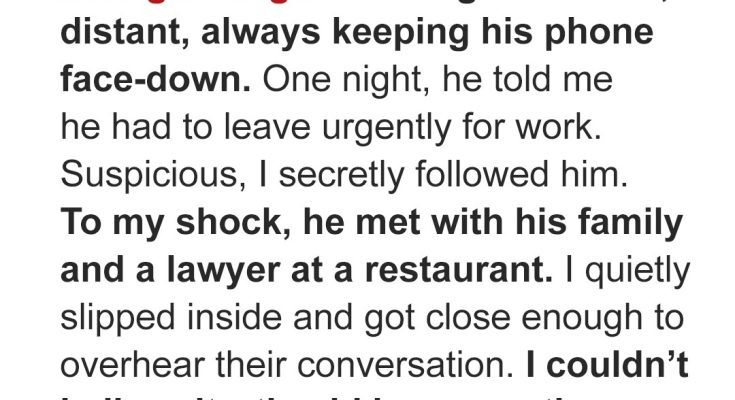 I secretly followed him. The city lights blurred through my rising panic. He pulled into a parking lot near an upscale Italian restaurant, one we used to celebrate special occasions at. My stomach lurched. I watched him go inside. And then I saw them—his mother, his sister, already seated at a discreet corner table. And a man I didn’t recognize, meticulously dressed in a sharp suit, a briefcase on the chair beside him. A lawyer. My blood ran cold.
