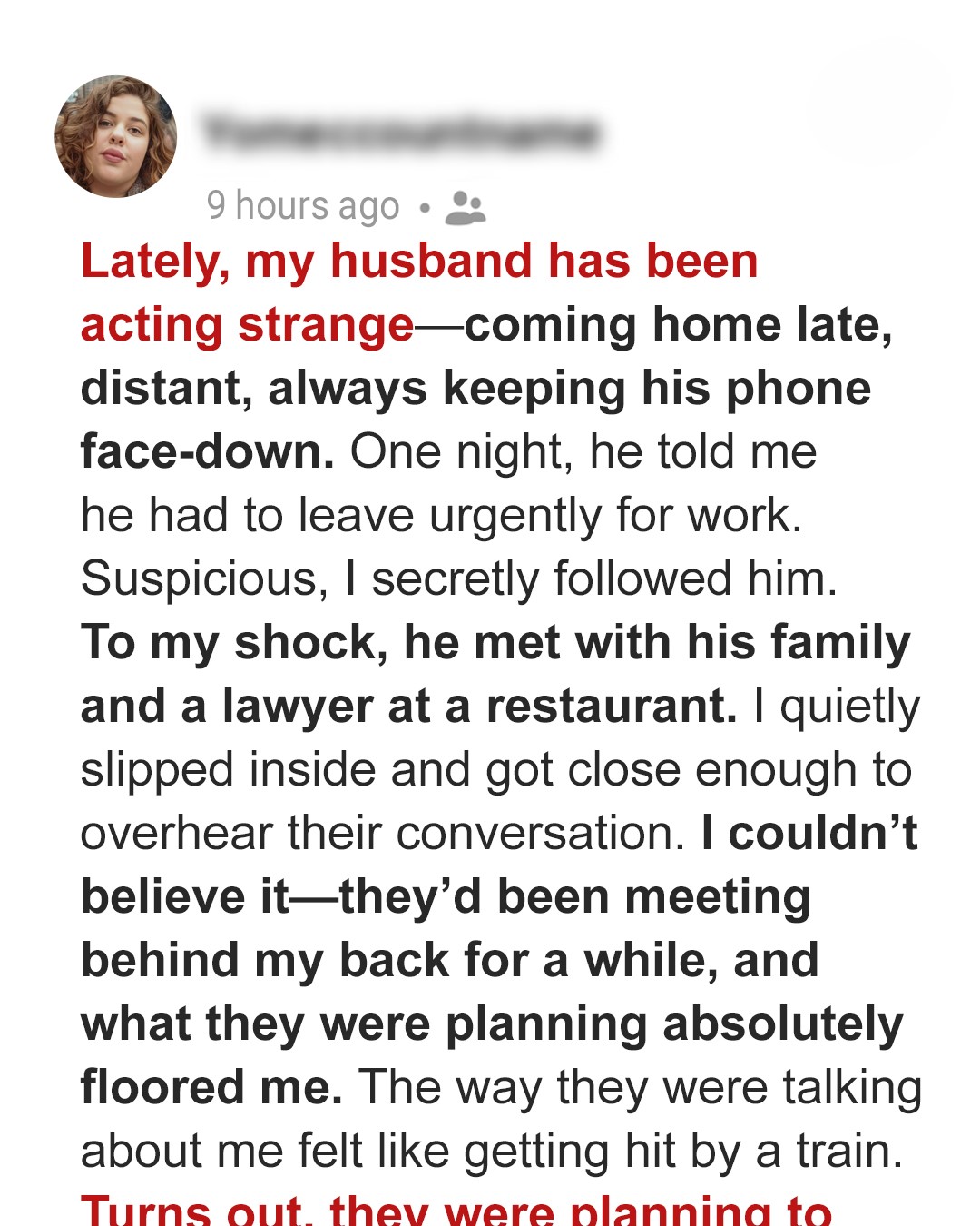 Lately, my husband has been acting strange—coming home late, distant, always keeping his phone face-down. His eyes, once so open and loving, now darted away whenever I tried to catch his gaze. Every touch felt forced. Every conversation felt like a performance. I tried to ask what was wrong, to reach out, but he’d just sigh, mumble about work, and retreat further behind a wall of silence. The air in our home grew heavy with unspoken things, with a dread I couldn’t name. One night, he told me he had to leave urgently for work. An “emergency client meeting,” he said, at this hour. His voice was too steady, too controlled. He barely looked at me when he said it, just grabbed his keys and vanished. My gut, however, was screaming. A cold, hard knot in my stomach formed. I just had to know. My hands trembled as I snatched my own keys, my heart pounding a frantic rhythm against my ribs.