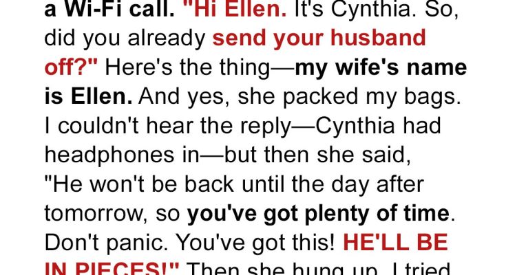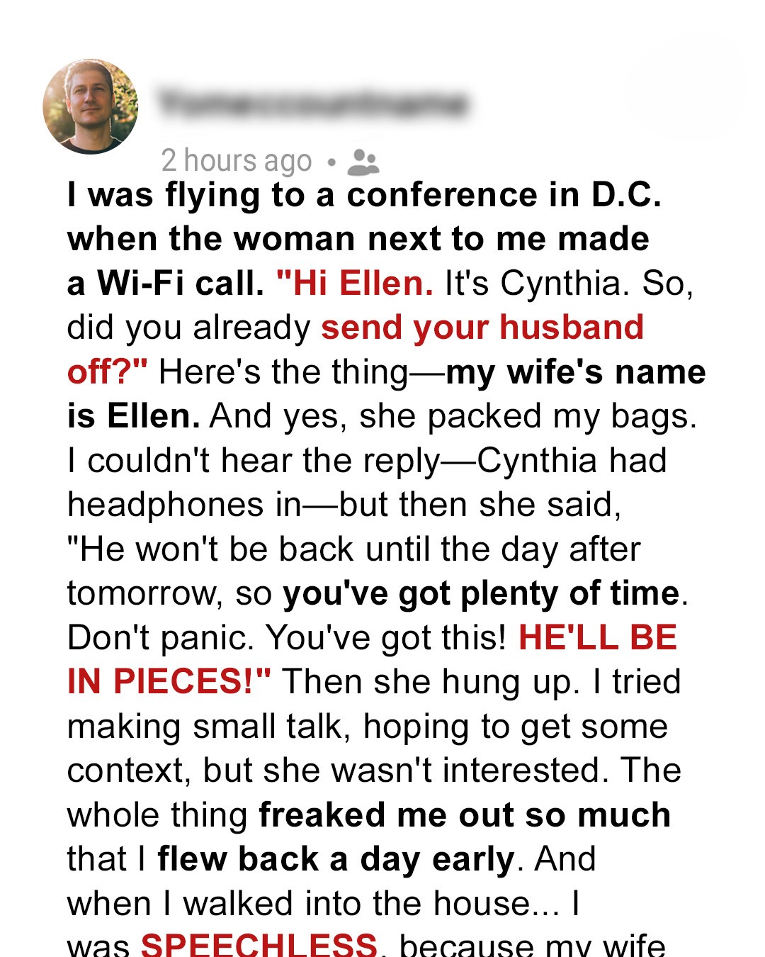 I was on the plane, heading to a dull conference in D.C. Just another Tuesday. I had my headphones in, trying to zone out, when the woman next to me started a Wi-Fi call. Her voice was loud, chirpy. “Hi Ellen. It’s Cynthia. So, did you already send your husband off?” My blood ran cold. Ellen. That’s my wife’s name. And yes, she’d packed my bags just this morning. A knot tightened in my stomach. No, it’s a coincidence. There are other Ellens. I tried to focus on my podcast, but my ears were straining. Cynthia was still talking, but I couldn’t hear the reply—she had her headphones in. Then she said, louder, more conspiratorial, “He won’t be back until the day after tomorrow, so you’ve got plenty of time. Don’t panic. You’ve got this! HE’LL BE IN PIECES!” She hung up, a smug smile on her face.