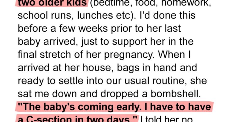 The flight from Britain felt longer than usual, even though I’d done it countless times. Two weeks before her due date, and I was back, just as I’d promised. Just as I’d done for her last baby. My best friend. My sister by choice. I spent weeks planning, saving up, taking time off work, ready to be her rock. Ready to manage the chaos of her two older kids – the school runs, the homework battles, the endless snacks, the bedtime stories. Anything she needed. I’d packed my bags with all the things she liked, little treats from home, ready to dive into our familiar rhythm of shared laughter and late-night talks. I walked into her house, bags clutched in my hands, a smile already forming, but it faltered when I saw her face. Gaunt. Pale. She sat me down on the sofa, not even bothering with a hug. My heart started to race. “The baby’s coming early,” she whispered, her voice barely audible. “I have to have a C-section. In two days.” My mind immediately went into overdrive. Okay, deep breath. New plan. Still here. I told her it was no worries, that I was still here to help however I could. I assumed I’d still be managing the kids, making comforting meals, handling errands while she recovered. That was what best friends did.