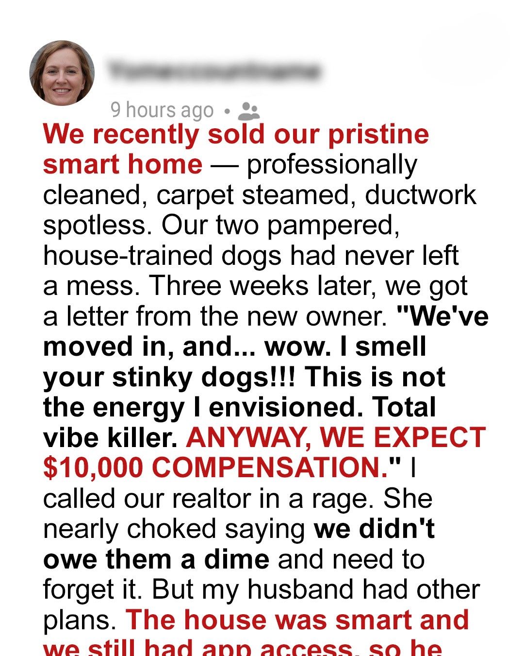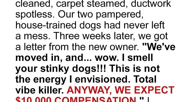We had poured everything into that house. Every penny, every dream. It was a true smart home, a modern marvel of pristine surfaces and gleaming tech. We had two rescue dogs, our babies, but you’d never know they lived there. They were pampered, house-trained to perfection, leaving no trace. Before we sold it, we had it professionally cleaned top to bottom: carpets steamed, ductwork spotless, every corner scrubbed. It was immaculate. Absolutely spotless. Three weeks after closing, the letter arrived. It wasn’t from the realtor. It was from the new owner, handwritten, with an aggressive slant. “We’ve moved in, and… wow. I smell your stinky dogs!!! This is not the energy I envisioned. Total vibe killer. ANYWAY, WE EXPECT $10,000 COMPENSATION.” My jaw dropped. Stinky dogs? IMPOSSIBLE.