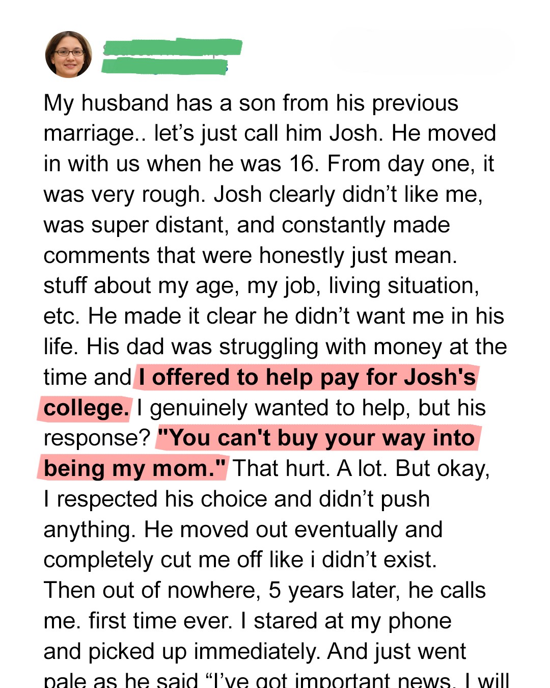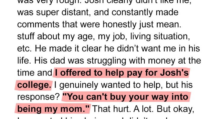 It wasn’t just silent disapproval. He made it CRYSTAL CLEAR he wanted me out of his life. He’d ignore me when I spoke, leave rooms when I entered, and talk over me as if I were invisible. My heart ached for him, for the lost boy underneath the anger, but also for myself. Why did he despise me so intensely?