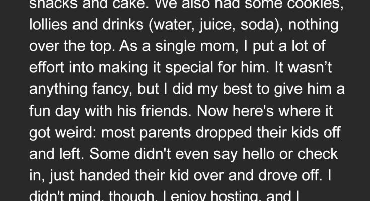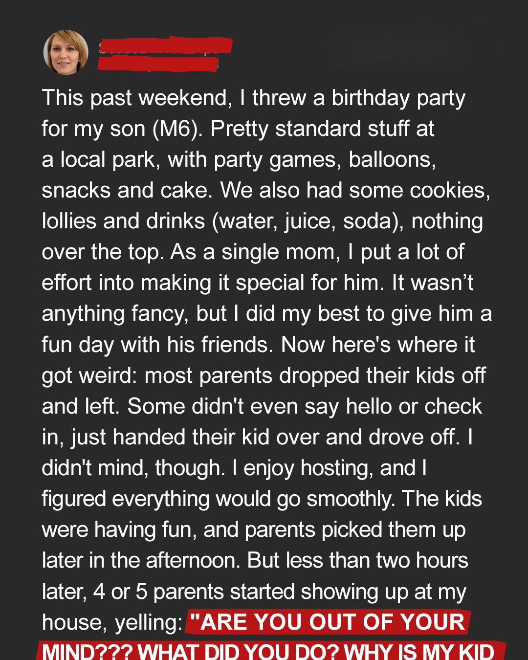 This past weekend, I threw a birthday party for my son. My little man, turning six. As a single mom, I poured everything into making it special for him. We had it at a local park – bouncy castle, party games, balloons, snacks and cake. Nothing fancy, just wholesome fun. I’d stocked up on cookies, lollies, and drinks, trying to make sure every kid had something they liked. I didn’t have a lot of help, but I didn’t mind. I loved seeing his face light up. What I did find a little odd was how many parents just dropped their kids off. No hello, no quick chat, just handed over their child and drove off. It stung a little, I admit, feeling like a glorified babysitter. But I brushed it off. The kids were having a blast, my son was ecstatic, and that’s all that mattered. The afternoon passed without a hitch. Parents came, collected their sugar-hyped children, thanked me, and left. I cleaned up, exhausted but happy. I’d done it. Another successful party.