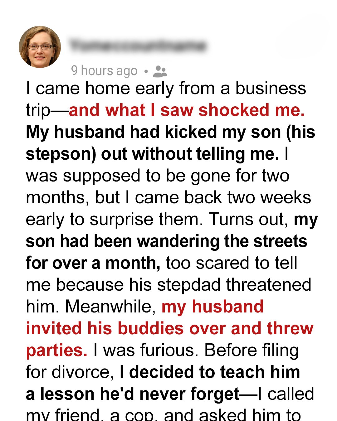 “Where’s our son?” I asked, my voice suddenly sharp. His eyes darted away. He mumbled something about him being with friends, then quickly changed the subject to my trip. My stomach clenched. This isn’t right. The house smelled faintly of stale beer, and there was an empty pizza box on the counter. Too many glasses in the sink. He’d been throwing parties. While I was thousands of miles away, working my fingers to the bone, sending money home.