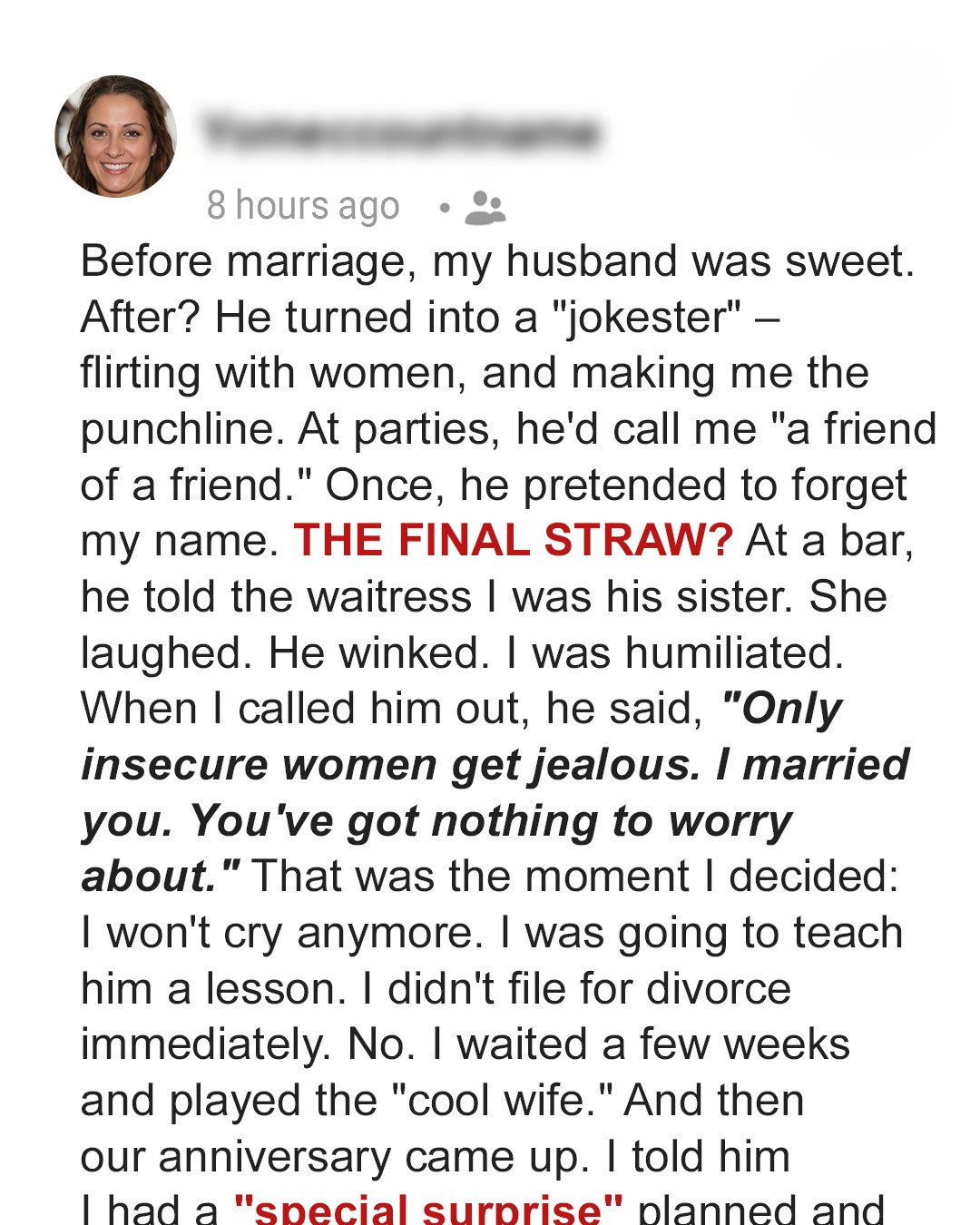 I swore I wouldn’t cry again. That was the promise I made myself, staring at my reflection after he called me his “sister” to that giggling waitress. His casual wink, her shared laughter—it had been the final, bitter drop in a sea of humiliation. He thought it was a joke. I thought it was a knife to the heart, over and over. Only insecure women get jealous, he’d said. I married you. You’ve got nothing to worry about. Oh, but I had everything to worry about. I decided right then I wouldn’t file for divorce. Not yet. I would play the “cool wife” for a few weeks, let him think he’d won, let him think I’d finally accepted my role as the punchline. And then our anniversary came up. I told him. I told him we should celebrate, just the two of us, at that fancy Italian place he loved. He beamed. He probably thought he was finally getting the compliant wife he’d always wanted, one who overlooked his little “quirks.” I picked out my dress carefully: emerald green, sleek, sophisticated. I did my hair, my makeup. I wanted to look beautiful, yes, but more than that, I wanted to look unbreakable. When I walked into the restaurant, he was already there, nursing a drink, a smug smile playing on his lips. He stood, kissed my cheek, and pulled out my chair. All the old charms, briefly resurrected for show.