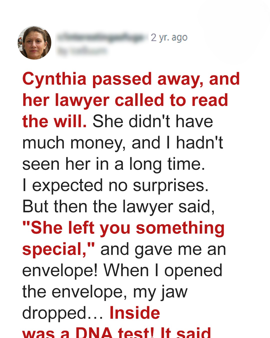 Cynthia passed away, and her lawyer called to read the will. She didn’t have much money, and I hadn’t seen her in a long time. My older sister. We’d been inseparable once, sharing secrets, dreams, even clothes. But somewhere along the line, life, or maybe something unspoken, had pulled us apart. A slow, quiet unraveling until phone calls became yearly, then stopped altogether. I expected no surprises. Why would I even be in her will? A courtesy, I supposed, a final nod to a relationship that had withered. The lawyer, a stiff man in a charcoal suit, droned through legal jargon in a quiet office that smelled faintly of old paper and dust. I picked at a loose thread on my sleeve, half-listening, ready for it to be over.