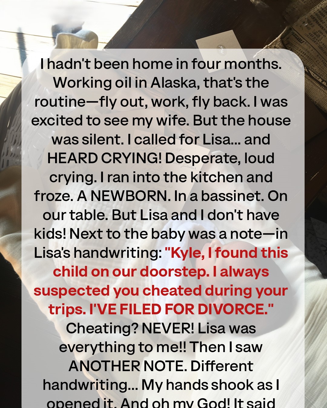 I hadn’t been home in four months. Working oil in Alaska, that’s the routine—fly out, work, fly back. The flight was long, the journey longer, but I was buzzing. So excited to see my wife. Lisa. Just picturing her face made the exhaustion melt away. I pictured her running to me, laughing, our usual reunion. But the house was silent when I pushed open the door. Too silent. No music playing, no dinner smells. “Lisa?” I called out, my voice echoing in the stillness. A chill ran down my spine. Where is she? I walked through the living room, heading for the kitchen, where she usually was.