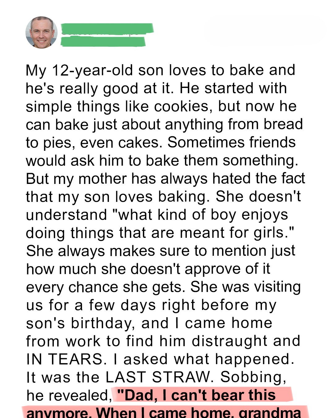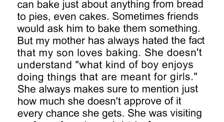 My son, he’s twelve, and he lives for baking. It started innocently enough, just simple cookies, but it quickly escalated. Now, he’s a wizard with dough, a true artisan. Bread, pies, intricate cakes – you name it, he bakes it. His friends rave about his creations. Sometimes, they even ask him to bake for their own parties, and he lights up at the request. He’s found his passion, a joyful, creative outlet that makes him beam. But my mother, his grandmother, has always hated it. Absolutely despised it. From the moment he first showed interest, she’d dismiss it with a wave of her hand. “What kind of boy,” she’d sigh, “enjoys doing things that are meant for girls?” It wasn’t just a casual comment; it was a constant drip, drip, drip of disapproval. Every visit, every phone call, she’d find a way to undermine his hobby, to make him feel ashamed of his unique talent. I tried to shield him, to tell her to stop, but she’d just wave me off with a dismissive “I’m just being realistic.”