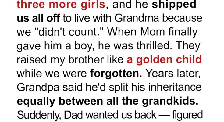I’m the oldest of five, a truth that felt less like a birthright and more like a burden from the moment I could understand. Dad wanted a son. He didn’t get one. He got me instead. Then came three more girls, each a fresh disappointment in his eyes. We were just… extra. Useless. He shipped us all off to live with Grandma. Didn’t count, he’d say, a phrase that echoed in the quiet corners of my childhood. We were forgotten, relegated to a life of hand-me-downs and Grandma’s tired but constant love, while our parents built their “real” family. Then, Mom finally gave him a boy. A son. He was thrilled. A golden child, polished and presented to the world, while we remained out of sight, out of mind. Years passed. We grew up at Grandma’s, a forgotten sisterhood. But then, Grandpa, bless his kind heart, announced he’d split his inheritance equally between all the grandkids. Suddenly, Dad wanted us back. Figured he’d cash in on our shares.