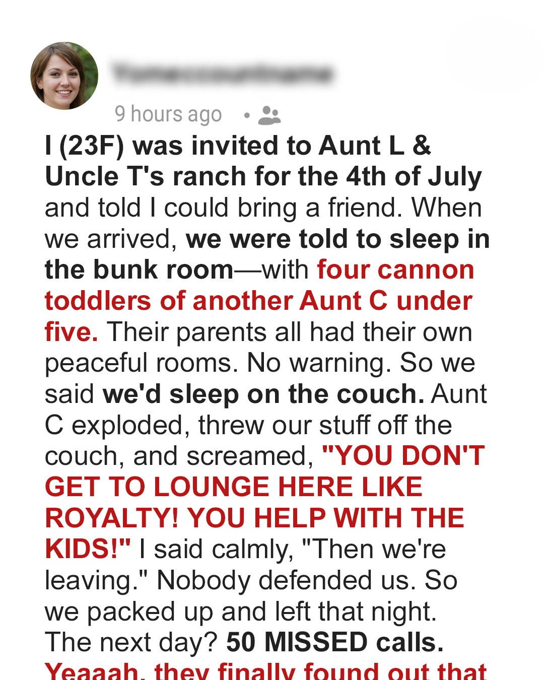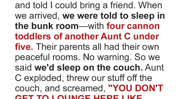 That’s when Aunt C walked in. She’d clearly had a few too many drinks. Her eyes narrowed. She saw our bags by the couch, our quiet rebellion.