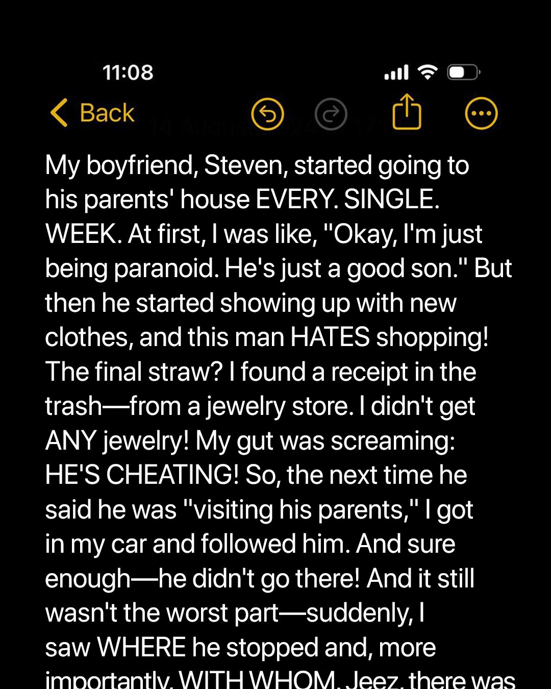 My boyfriend, he started going to his parents’ house EVERY. SINGLE. WEEK. It wasn’t just a casual Sunday dinner; it was a pilgrimage. Every Tuesday evening, without fail. At first, I tried to be reasonable. I was like, “Okay, I’m just being paranoid. He’s just a good son.” I pushed the nagging feeling down, told myself I was being clingy, insecure. He deserved time with his family. But the feeling festered. Then, things got weird. He started showing up with new clothes. Not just a shirt here or there, but a whole new wardrobe rotation. And this man HATES shopping! He’d rather have a root canal than spend an hour in a mall. He’d buy five identical t-shirts to avoid having to pick anything out. This sudden interest in his appearance, combined with the mysterious weekly disappearances, started a cold knot in my stomach. It was too convenient. Too neat.