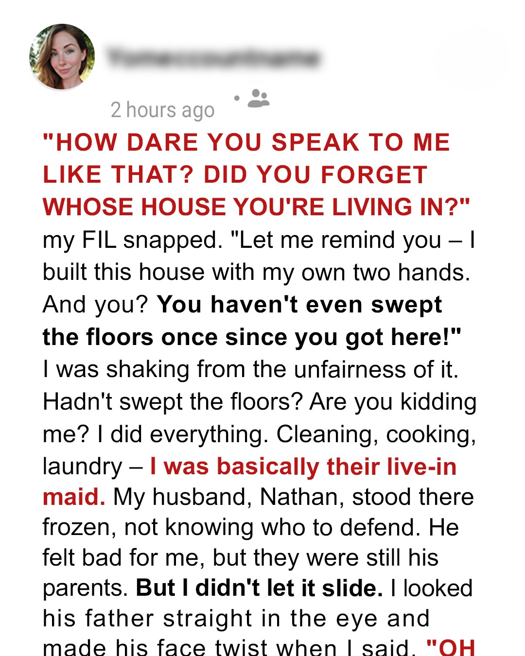 “HOW DARE YOU SPEAK TO ME LIKE THAT? DID YOU FORGET WHOSE HOUSE YOU’RE LIVING IN?” my FIL snapped. “Let me remind you — I built this house with my own two hands. And you? You haven’t even swept the floors once since you got here!” I was shaking from the unfairness of it. Hadn’t swept the floors? Are you kidding me? I did everything. Cleaning, cooking, laundry — I was basically their live-in maid. My husband, Nathan, stood there frozen, not knowing who to defend. He felt bad for me, but they were still his parents. But I didn’t let it slide. I looked his father straight in the eye and made his face twist when I said “OH”.