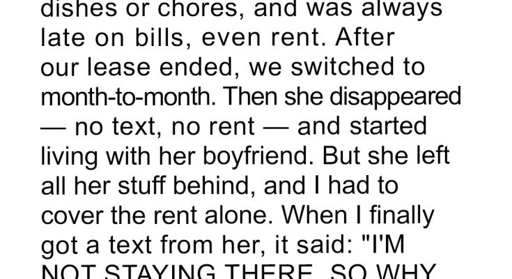 “I gave you until July 1st,” I said, pushing back, bracing the door with my foot. “I text you. I called you. You said, ‘I’M NOT STAYING THERE, SO WHY SHOULD I PAY RENT?’ Remember that, Milly? Remember how I had to cover your half? For months? Because you just disappeared?” The words spilled out, years of resentment and frustration bubbling to the surface. “You left your garbage everywhere, never cleaned, never bought toilet paper! I had to live with your mess, pay your bills, and then I had to pay your rent too, all while you were off living with your new boyfriend!”
