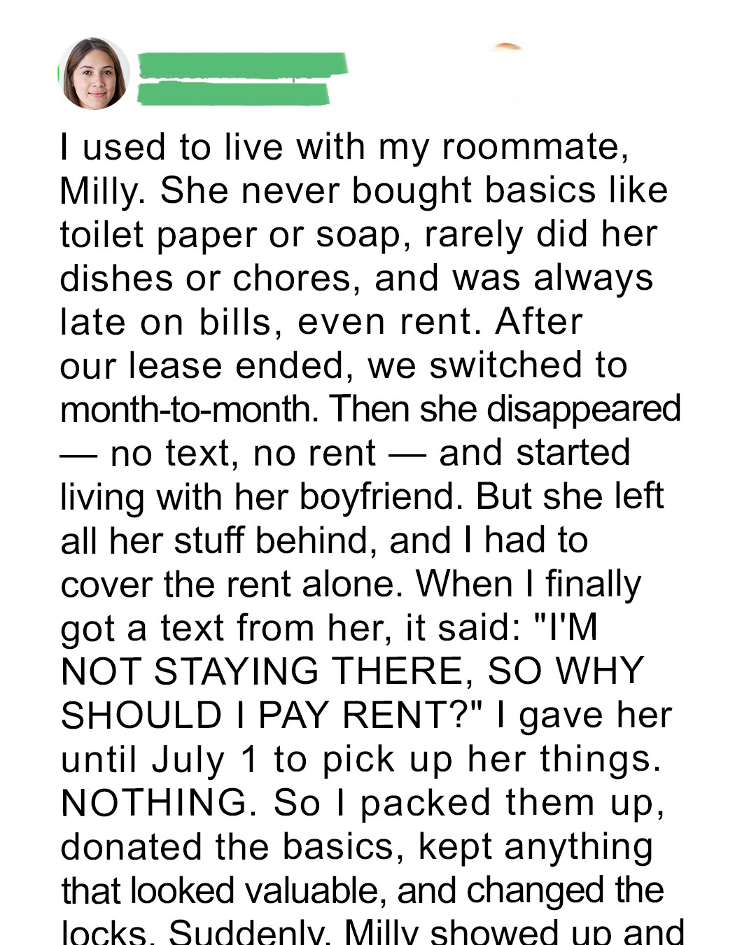 “I gave you until July 1st,” I said, pushing back, bracing the door with my foot. “I text you. I called you. You said, ‘I’M NOT STAYING THERE, SO WHY SHOULD I PAY RENT?’ Remember that, Milly? Remember how I had to cover your half? For months? Because you just disappeared?” The words spilled out, years of resentment and frustration bubbling to the surface. “You left your garbage everywhere, never cleaned, never bought toilet paper! I had to live with your mess, pay your bills, and then I had to pay your rent too, all while you were off living with your new boyfriend!”