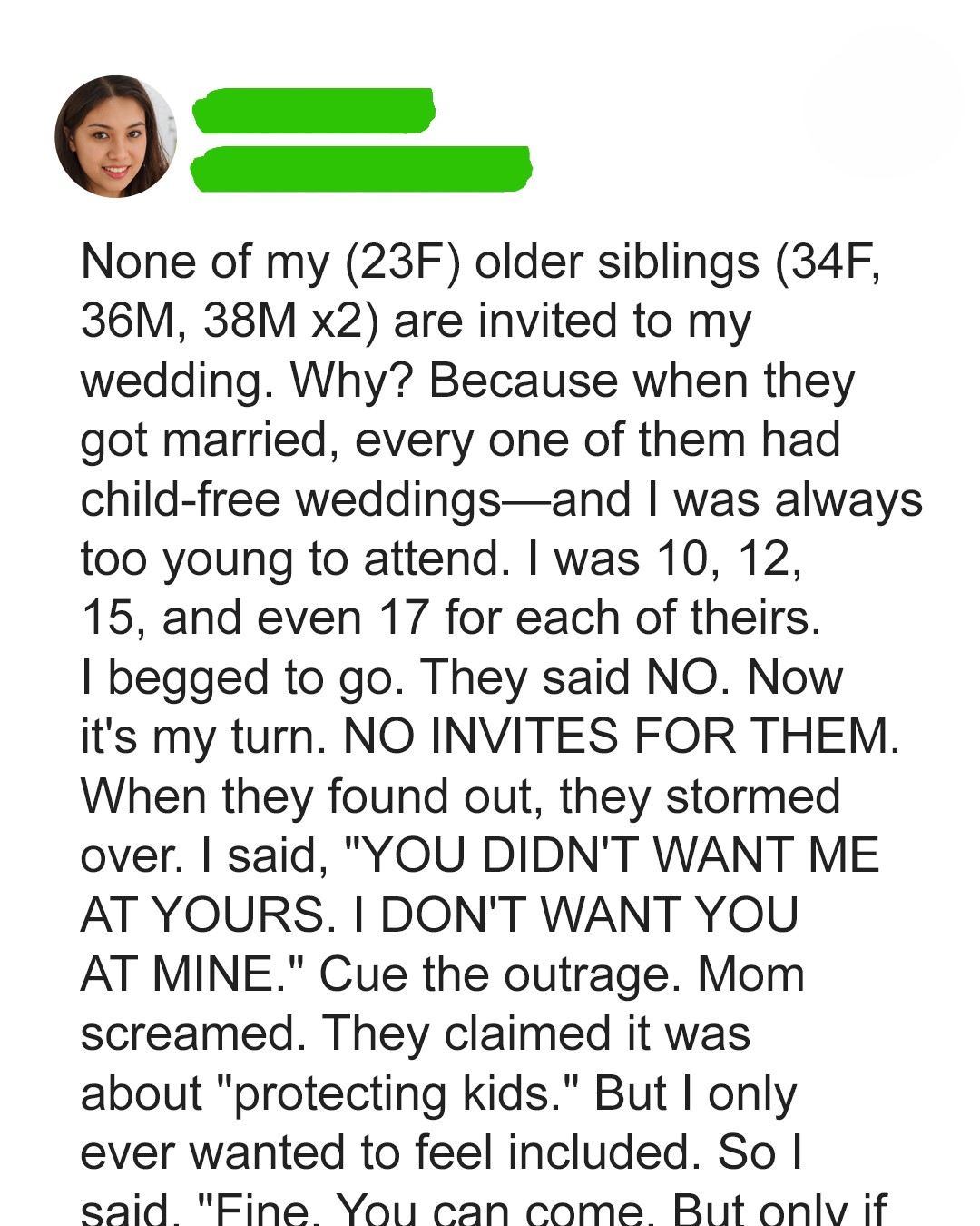 I’m getting married in three months. And no, my older siblings aren’t invited. None of them. My sister, 34. My brothers, 36, 38, and the other 38. They’ve all had their turn, their big day, their beautiful white weddings. And every single one of them had a child-free policy. I was 10 when my first brother got married. I remember begging. Please, just let me sit in the back. I won’t make a sound. My mom said, “Honey, it’s an adult party. You’re too young.” Fine.