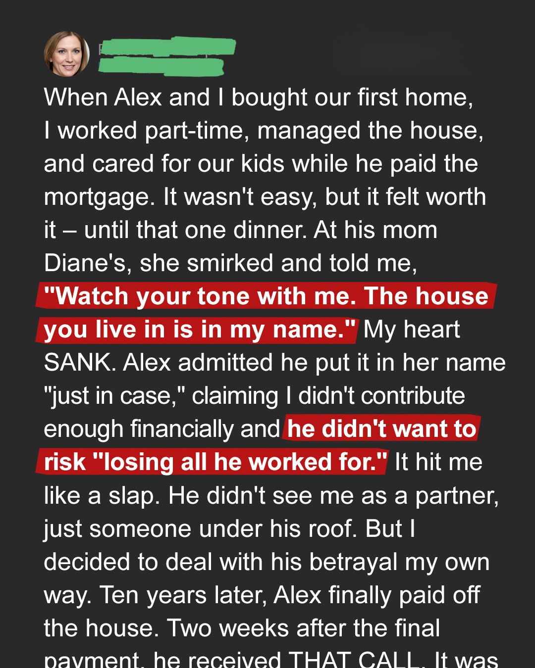 I just smile. Because now, finally, the house is truly mine. And our children, my children, will never have to worry about losing their home again. He built the house for his mother; I secured it for our family.
