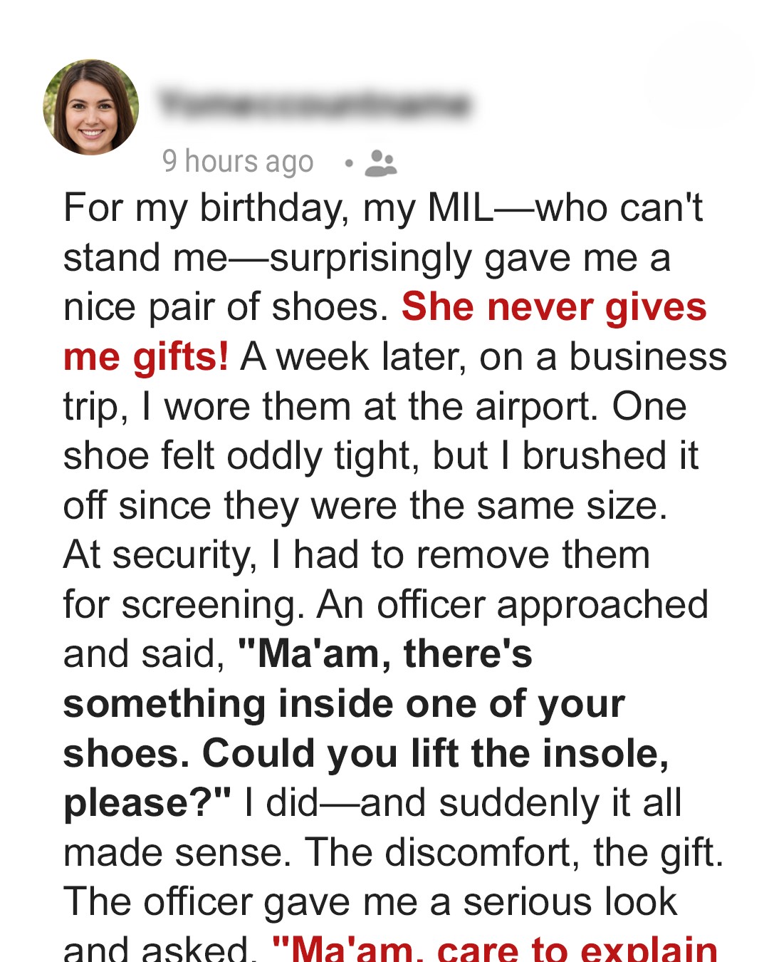 There are people in life who tolerate you, and then there are people who make it their personal mission to let you know you’re a mistake. My mother-in-law fell firmly into the latter category. She couldn’t stand the sight of me. Never had. So, when she handed me a beautifully wrapped box for my birthday, my jaw nearly hit the floor. Inside, a stunning pair of designer heels, exactly my size. I was speechless. What was her angle? I mumbled a thank you, utterly bewildered, and she just offered a tight, unsettling smile. She never gave me gifts. Not even a birthday card. A week later, I packed them for a business trip. A fancy dinner, a big presentation—they were perfect. At the airport, I slipped them on. One felt… off. A little tight, but the size was correct. I figured it was just new-shoe stiffness, or maybe a slight manufacturing anomaly. I walked a bit, tried to break them in, and shrugged it off. Just get through security, then you can relax.