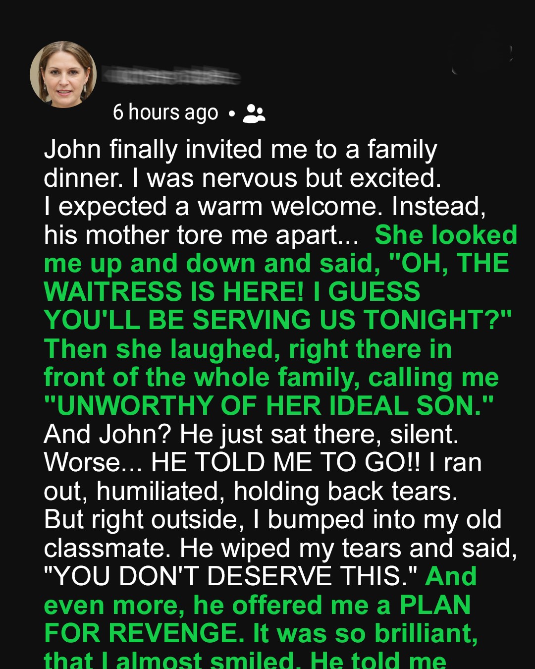 I remember the day he invited me. It was everything I’d dreamed of, a quiet, hesitant request from him to finally meet his family. My heart fluttered with a nervous joy. This was it. The next step. I spent hours picking out the perfect dress, rehearsing polite smiles, imagining a warm, welcoming embrace. I wanted to impress them, to show them I was worthy of their son. The moment I walked through their opulent front door, the air shifted. His mother’s eyes, cold and sharp, swept over me. A slow, venomous smile spread across her face. Then, the words that would forever echo in my nightmares: “OH, THE WAITRESS IS HERE! I GUESS YOU’LL BE SERVING US TONIGHT?” Her voice dripped with mock sweetness, loud enough for the entire, silent family to hear.