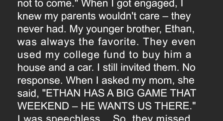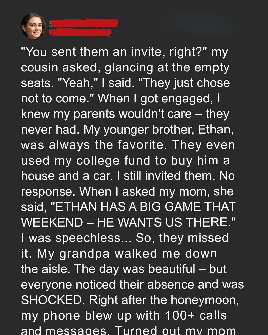 “You sent them an invite, right?” my cousin asked, glancing at the empty seats. “Yeah,” I said. “They just chose not to come.” When I got engaged, I knew my parents wouldn’t care — they never had. My younger brother, Ethan, was always the favorite. They even used my college fund to buy him a house and a car. I still invited them. No response. When I asked my mom, she said, “ETHAN HAS A BIG GAME THAT WEEKEND — HE WANTS US THERE.” I was speechless… So, they missed it. My grandpa walked me down the aisle. The day was beautiful — but everyone noticed their absence and was SHOCKED. Right after the honeymoon, my phone blew up with 100+ calls and messages. Turned out my mom… …was a mess. Not a ‘proud mother crying happy tears’ kind of mess, but a broken, hysterical mess. The first message I opened was from my aunt, a frantic, barely coherent string of words: “CALL ME NOW. IT’S ETHAN. IT’S BAD.” My heart sank. What now? What had Ethan done this time?