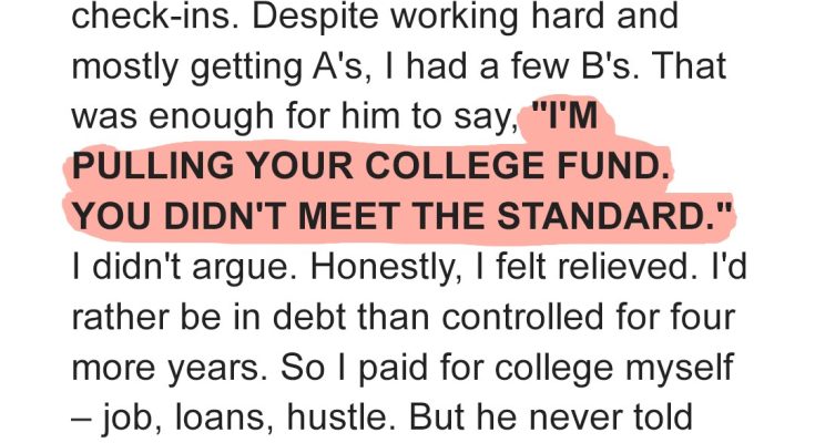 That was enough for him to sit me down, his face a stone mask, and declare, “I’M PULLING YOUR COLLEGE FUND. YOU DIDN’T MEET THE STANDARD.”