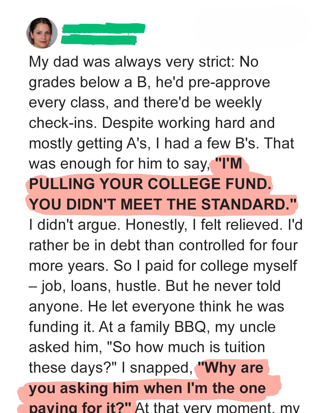 “The fund… there was never a college fund for you, sweetheart.”