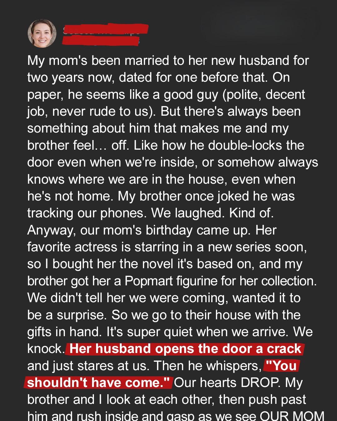 My mom’s been married to her new husband for two years now. They dated for one before that. On paper, he seems like a good guy. He’s polite, has a decent job, and has never once been rude to my brother or me. Never. That’s part of what made him so unsettling. He was too perfect. There’s always been something about him that made us feel… off. It wasn’t anything we could quite pinpoint, just a cold spot in the air whenever he was around, a smile that didn’t quite reach his eyes. Like how he’d double-lock the front door every single time, even if we were just stepping outside for a minute, even when we were all inside the house. Or how he somehow always knew where we were, even when he wasn’t home. He’d call Mom and ask if I was still in my room, or if my brother was out in the garage. My brother once joked that he was tracking our phones. We laughed. Kind of. A nervous, hollow laugh that didn’t quite reach our own eyes either.