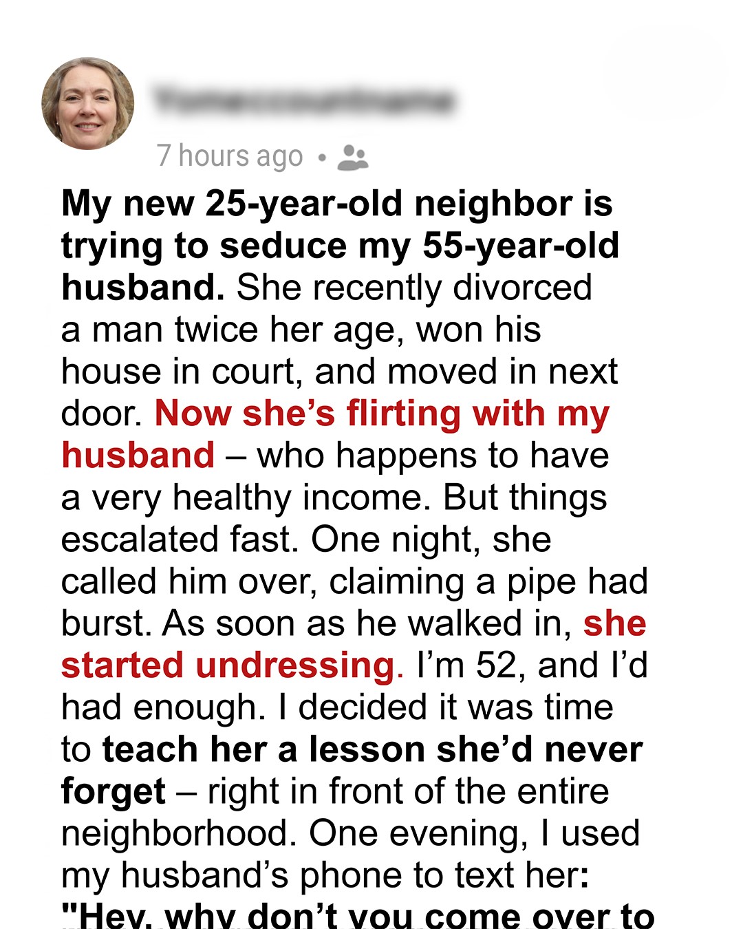 The opportunity presented itself at our annual summer BBQ. Every single neighbor would be there. I waited until my husband was distracted, then snatched his phone. My fingers trembled as I typed: “Hey, why don’t you come over to ours? My wife’s out for the evening. I have something… personal… to discuss.” I hit send. A triumphant surge. She would pay.