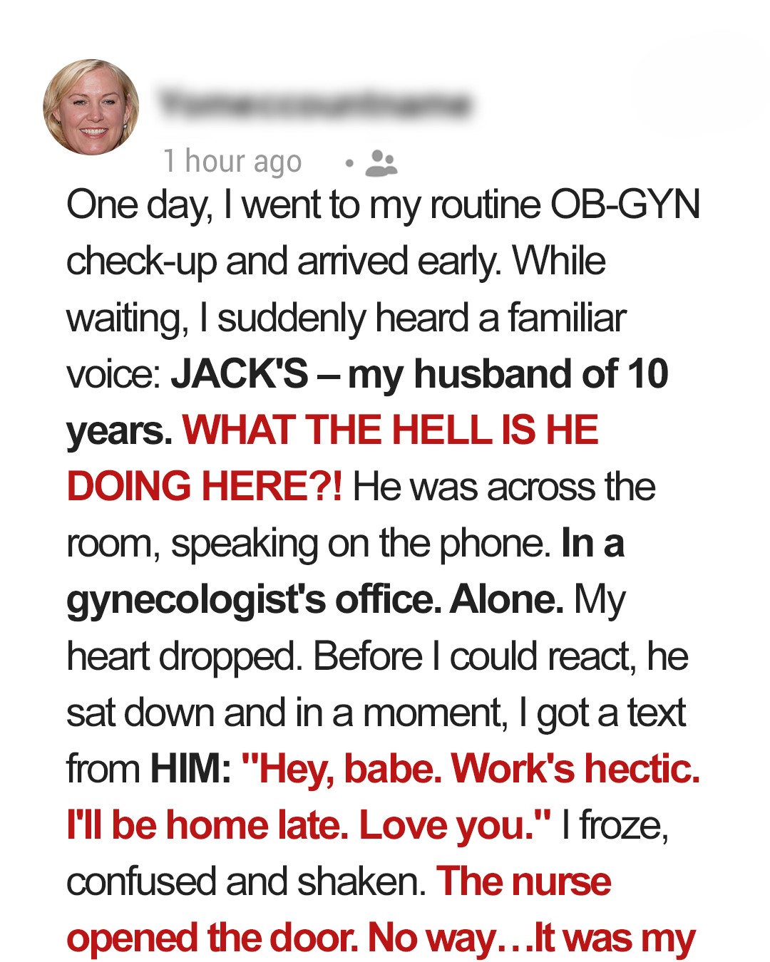 I went for my routine OB-GYN check-up, a day I usually dreaded, but this time, there was a tiny spark of hope. Maybe, just maybe, this would be the month. We’d been trying for so long, and every appointment felt like a new step on an impossible journey. I arrived early, settling into a hard plastic chair, trying to distract myself with a magazine, my stomach a knot of nerves and anticipation. Suddenly, a familiar voice cut through the hushed waiting room. It was my husband’s voice. My heart leaped into my throat, then plummeted straight to my stomach. What the hell is he doing here? He was across the room, his back partially to me, speaking quietly on his phone. In a gynecologist’s office. Alone.