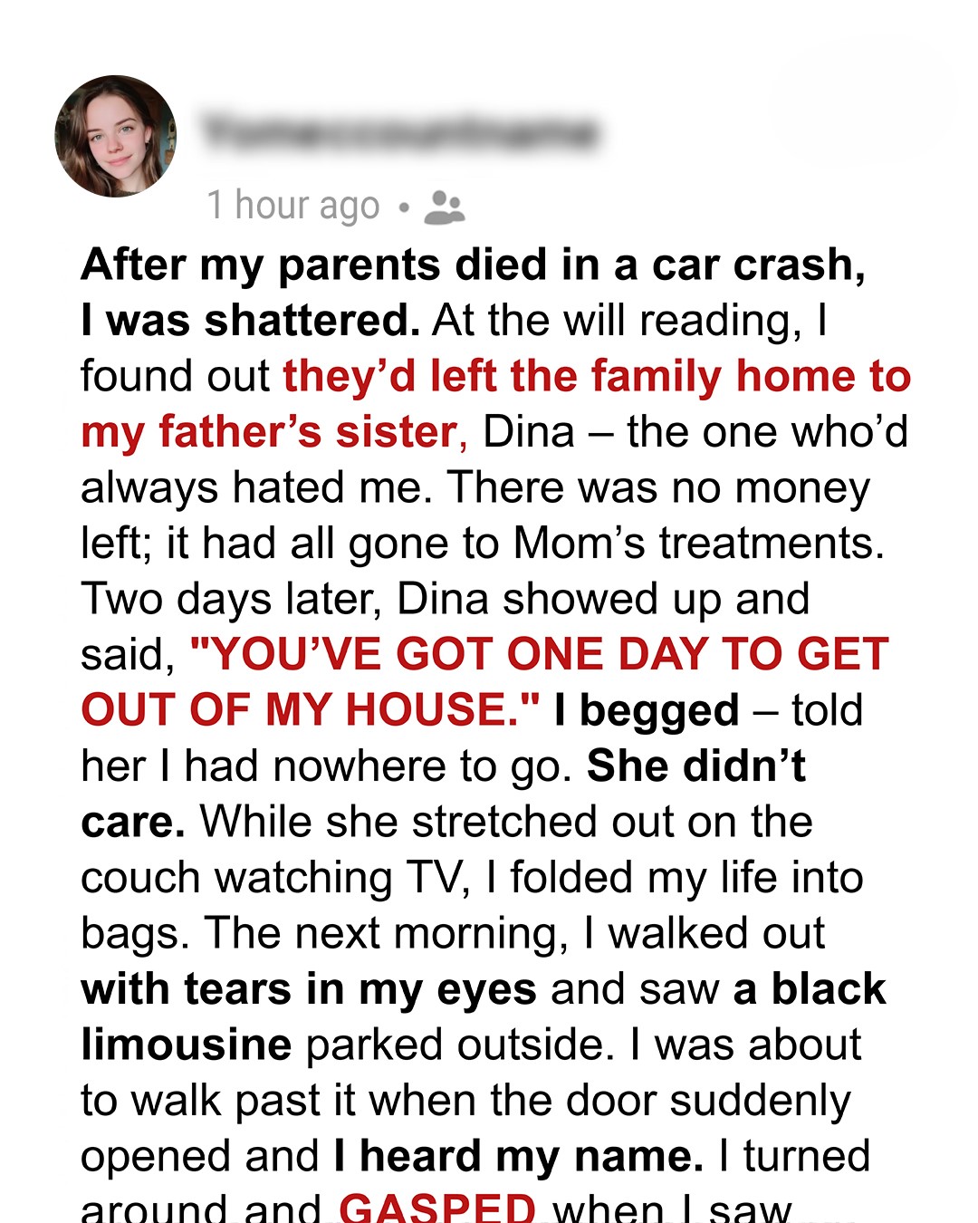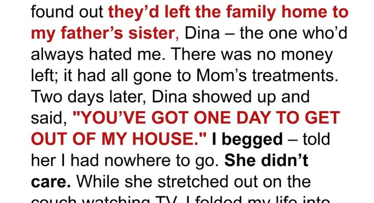 After my parents died in a car crash, I was shattered. Every breath was a fresh wound, every memory a dull ache that never faded. The world had gone silent, leaving me alone in its vast, echoing emptiness. Just weeks later, at the will reading, I found out the final, cruel joke: they’d left the family home to my father’s sister, Dina — the one who’d always hated me. There was no money left; it had all gone to Mom’s treatments, leaving behind a stack of bills and a void where our savings used to be. How could they have left me nothing? Two days later, Dina showed up. Her face was a mask of cold satisfaction. “YOU’VE GOT ONE DAY TO GET OUT OF MY HOUSE,” she said, her voice dripping with venom. I begged. I pleaded. I told her I had nowhere to go, no one to turn to, no money for even a single night in a motel. She just shrugged, stretched out on the living room couch, and flipped on the TV, ignoring my tears. My life was packed into two duffel bags while she watched a mindless sitcom.