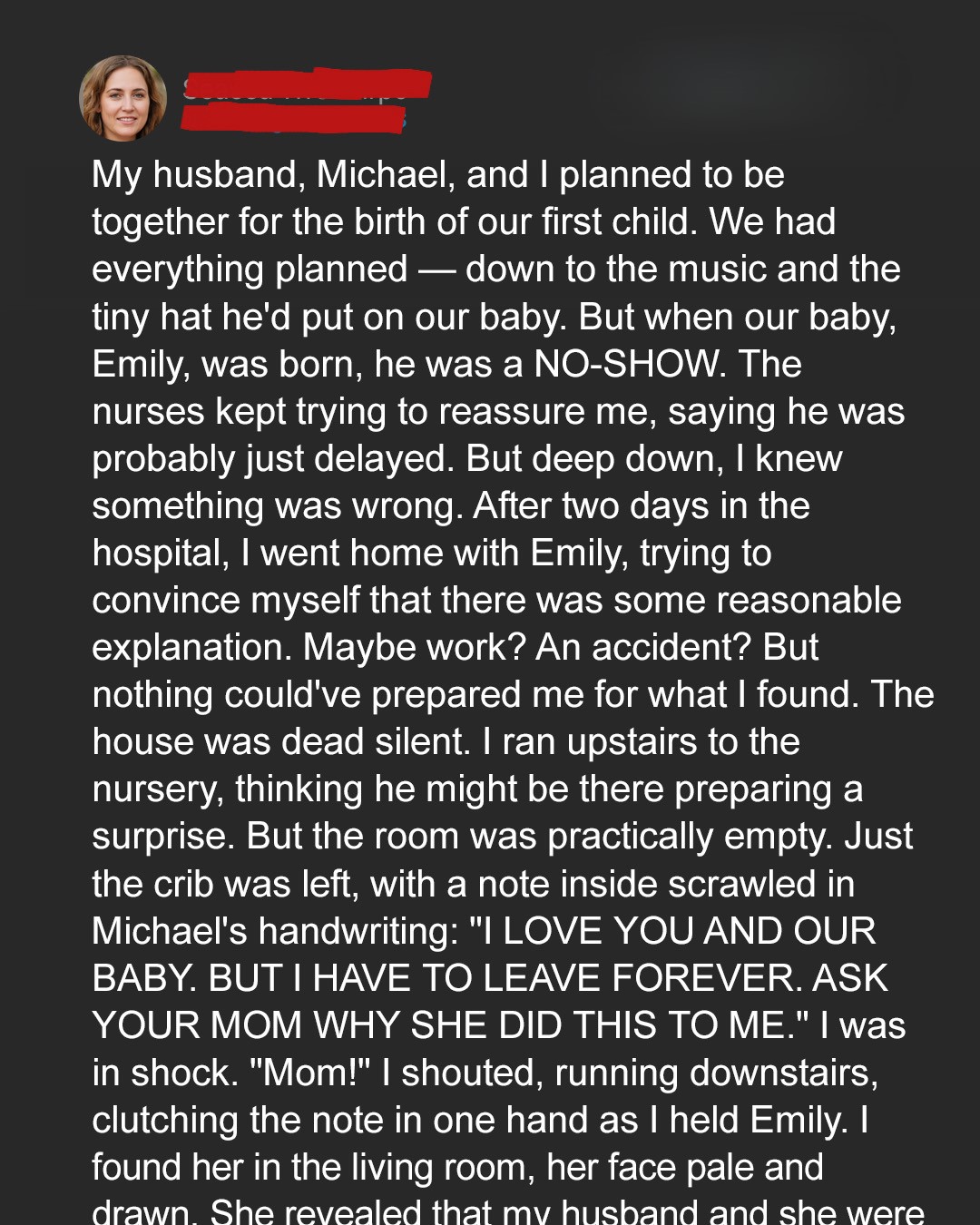 “MOM!” I shrieked, the sound tearing from my throat. My voice was ragged, desperate, a primal scream of disbelief. I clutched the note, my fingers white-knuckled, Emily still asleep in her carrier, blessedly unaware. I flew down the stairs, finding my mother in the living room. Her face was pale, drawn, her eyes red-rimmed. She looked like she’d aged ten years.