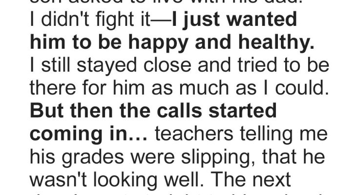 After the divorce, my 14-year-old son asked to live with his dad. I didn’t fight it—I just wanted him to be happy and healthy. It tore me apart, but I put his needs first. I still stayed close and tried to be there for him as much as I could. We had our regular dinners, weekend visits, calls almost every night. Everything seemed… fine. But then the calls started coming in… teachers telling me his grades were slipping, that he wasn’t looking well. They said he often seemed exhausted, distant. A cold dread began to curl in my stomach. The next day, I went straight to his school. I signed him out of his last class, my heart thumping against my ribs. He got in my car, and my heart sank—he looked exhausted. Not just tired, but truly, deeply worn out, with dark circles under his eyes. He seemed thinner, too.